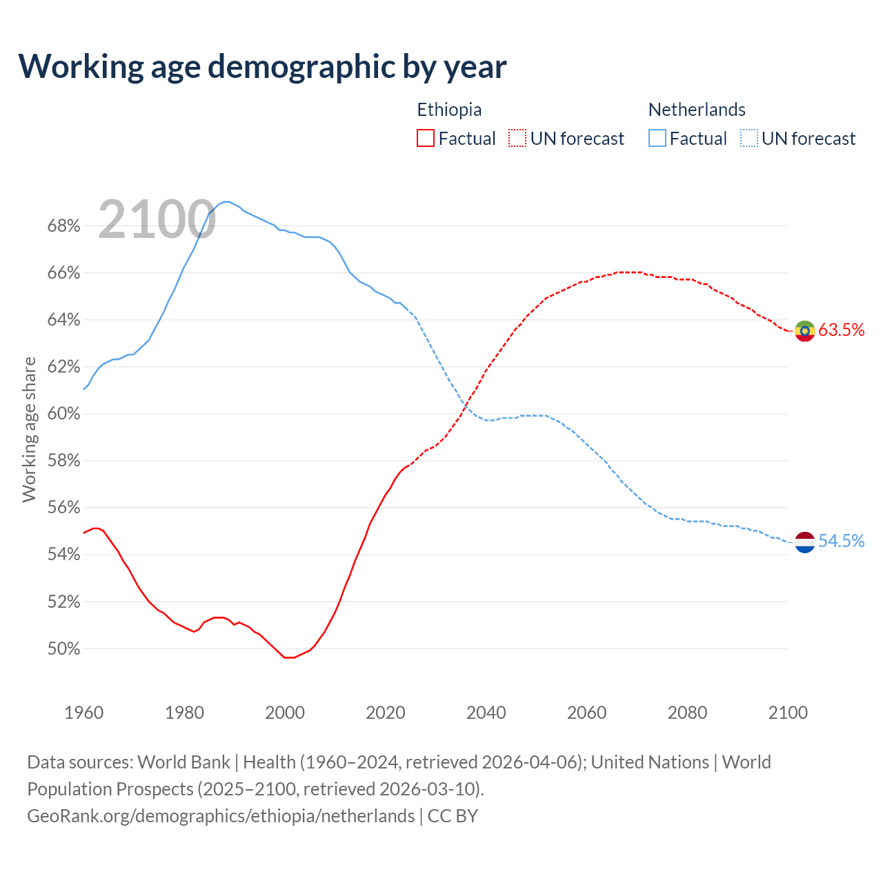 The share of older people aged 65 and over is 3.23% in Ethiopia and 20.5% in the Netherlands. Life expectancy in Ethiopia compared to the Netherlands .
