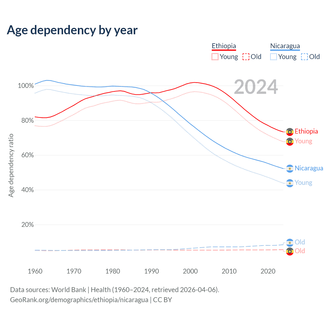 Data sources: World Bank | Health (1960–2024, retrieved 2026-04-06); U.S. Census Bureau (1960–2024, retrieved 2026-02-08).
