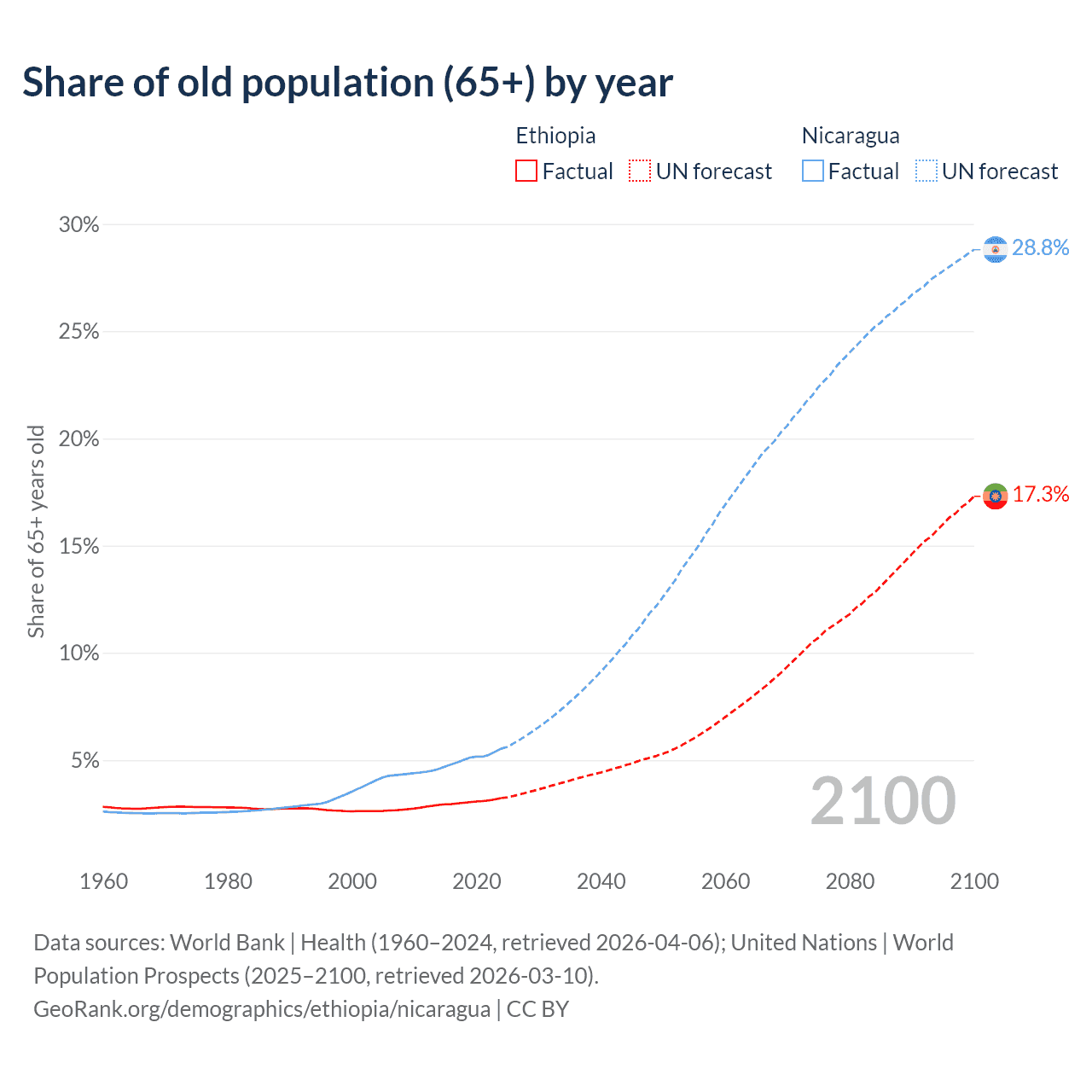 The share of older people aged 65 and over is 3.23% in Ethiopia and 5.53% in Nicaragua. Life expectancy in Ethiopia compared to Nicaragua .