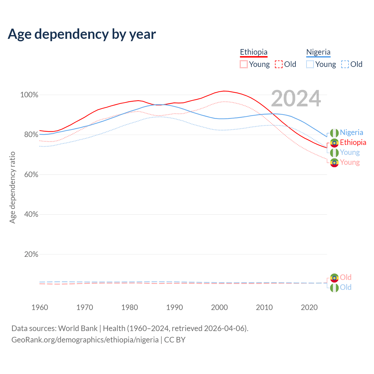Data sources: World Bank | Health (1960–2024, retrieved 2026-04-06); U.S. Census Bureau (1960–2024, retrieved 2026-02-08).