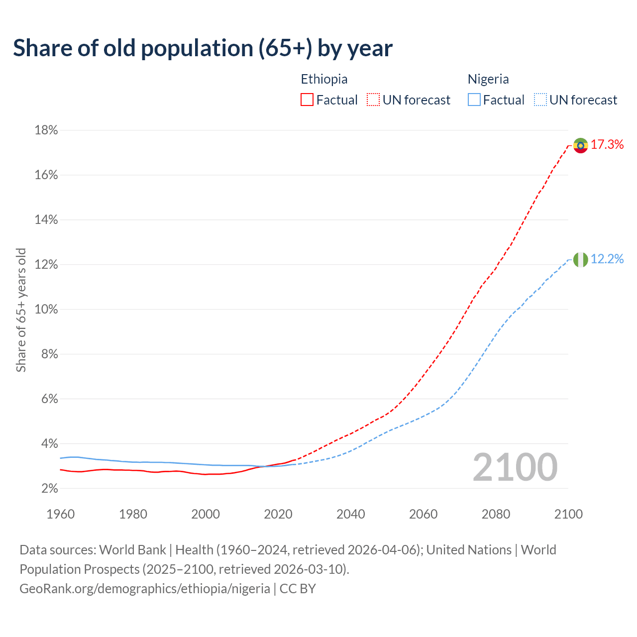 The share of older people aged 65 and over is 3.23% in Ethiopia and 3.05% in Nigeria. Life expectancy in Ethiopia compared to Nigeria .