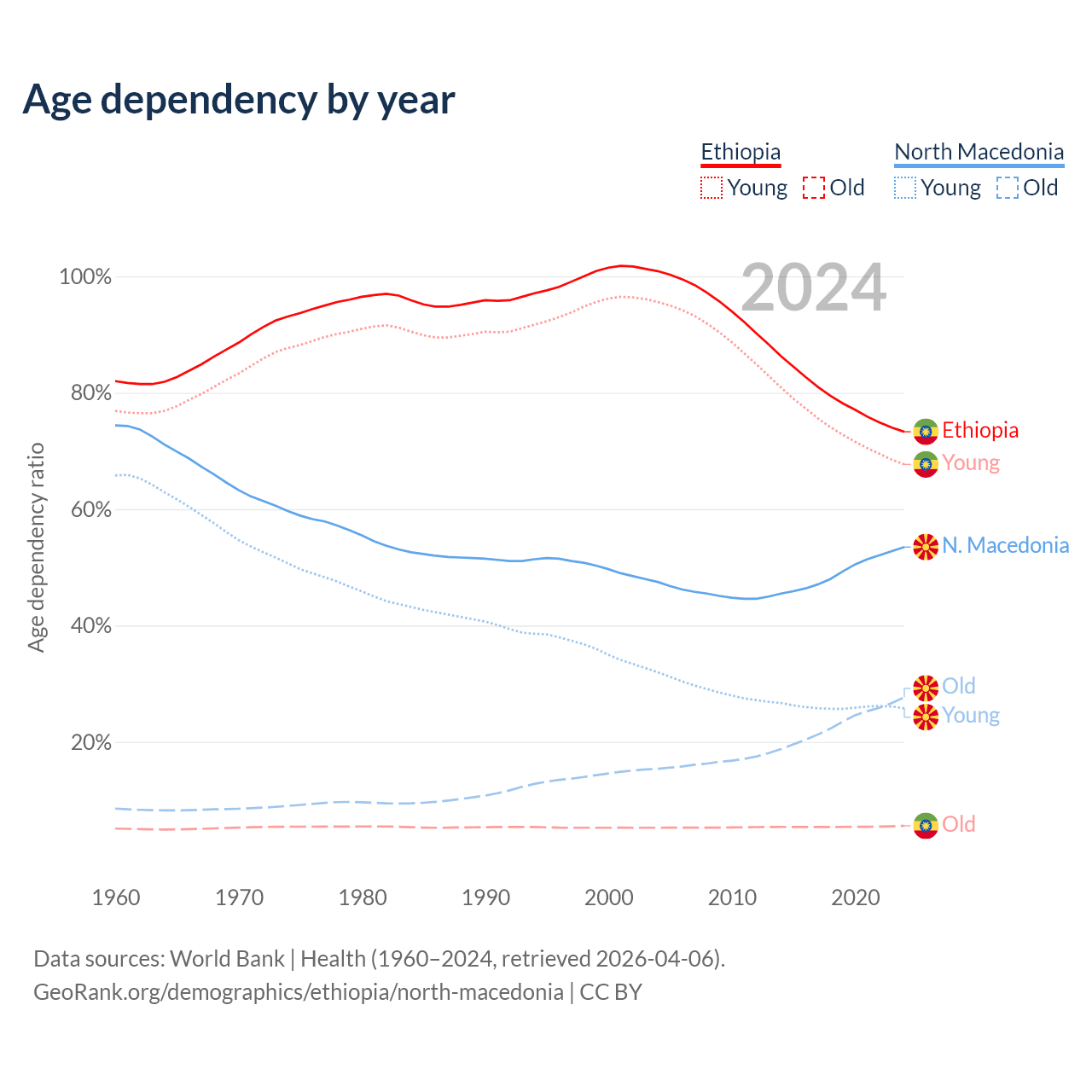 - Ethiopia is ranked 167/196 by median age (oldest to youngest) vs 37/196 for North Macedonia.