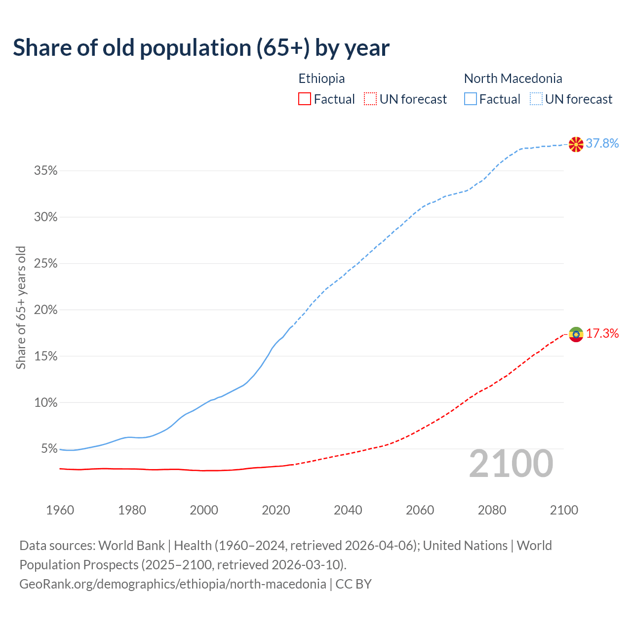 The share of older people aged 65 and over is 3.23% in Ethiopia and 18% in North Macedonia. Life expectancy in Ethiopia compared to North Macedonia .