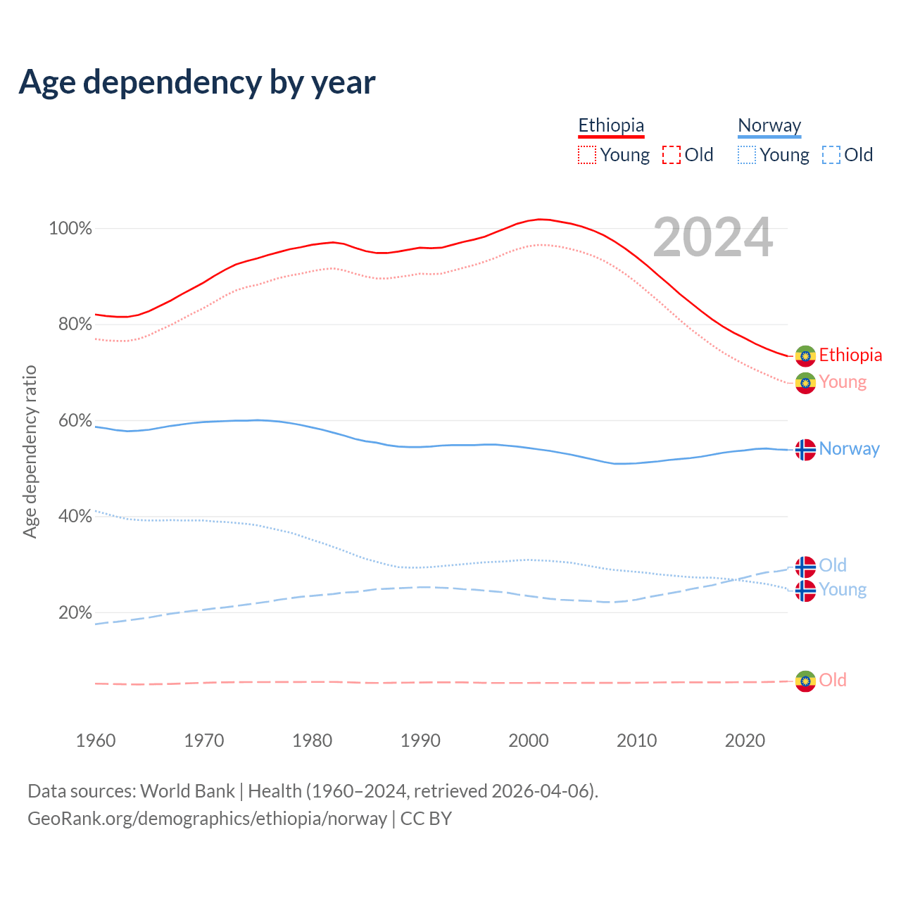 - Ethiopia is ranked 167/196 by median age (oldest to youngest) vs 43/196 for Norway.