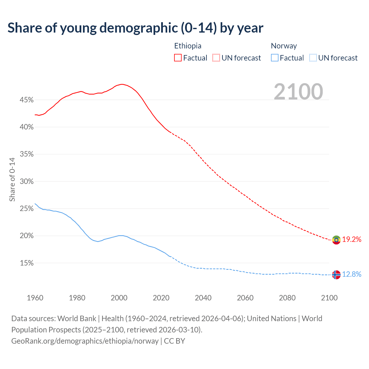 - The share of young demographic (0-15 years old) in Ethiopia is 39.1% vs 16.2% in Norway.