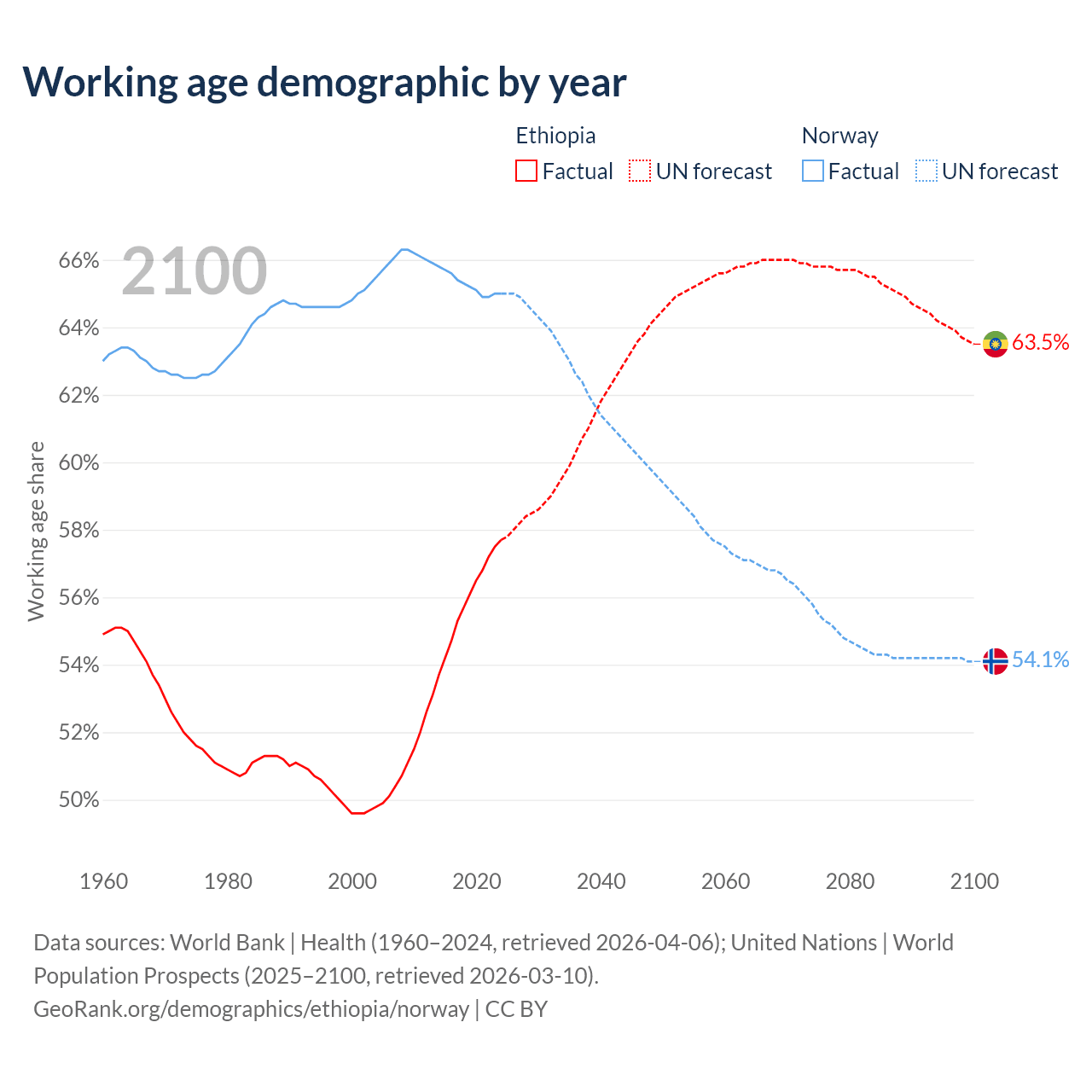 - Ethiopia has 80.7M working age adults (aged 15-64) vs 3.69M in Norway.
