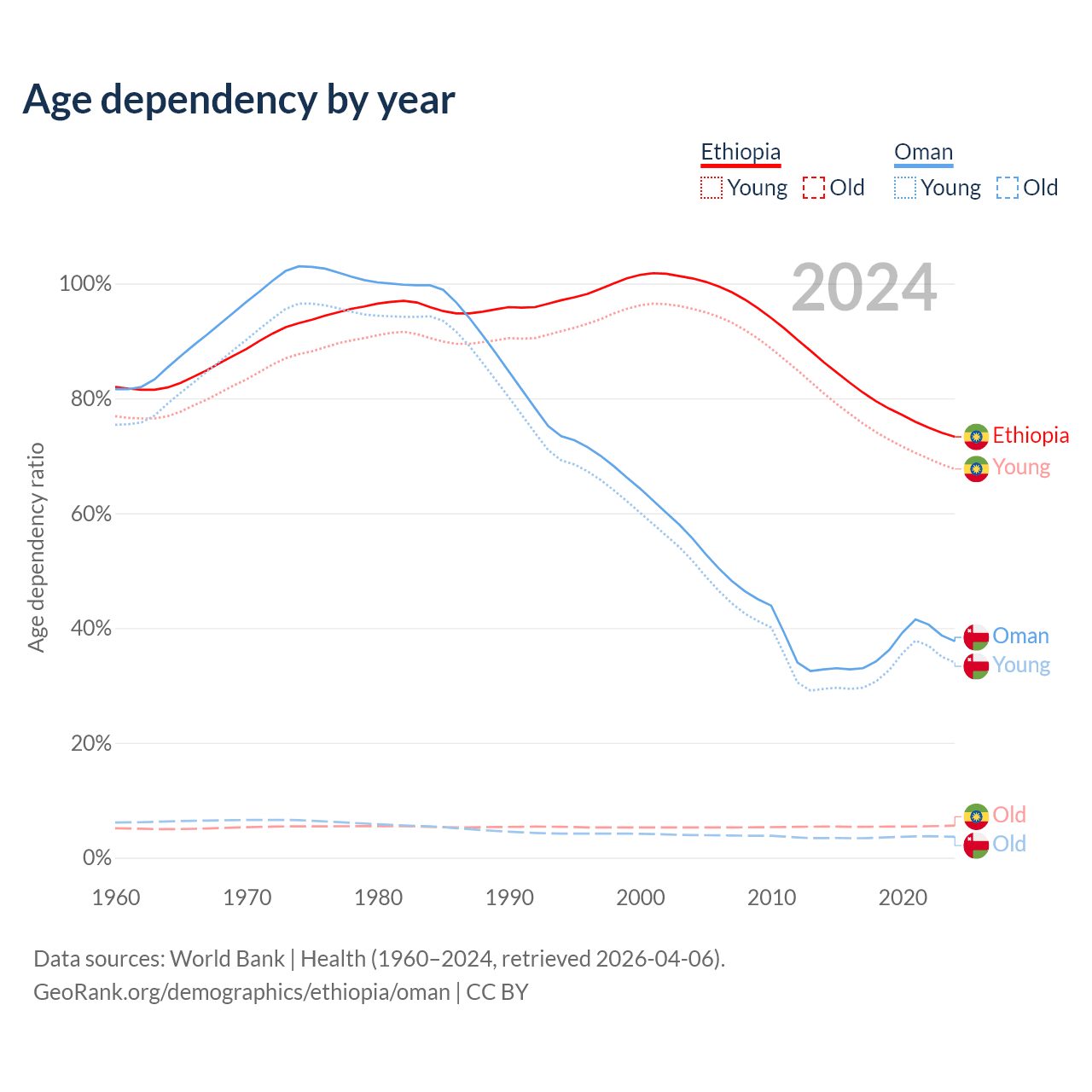 - The share of old-age demographic (65+) in Ethiopia is 3.23% vs 2.64% in Oman.