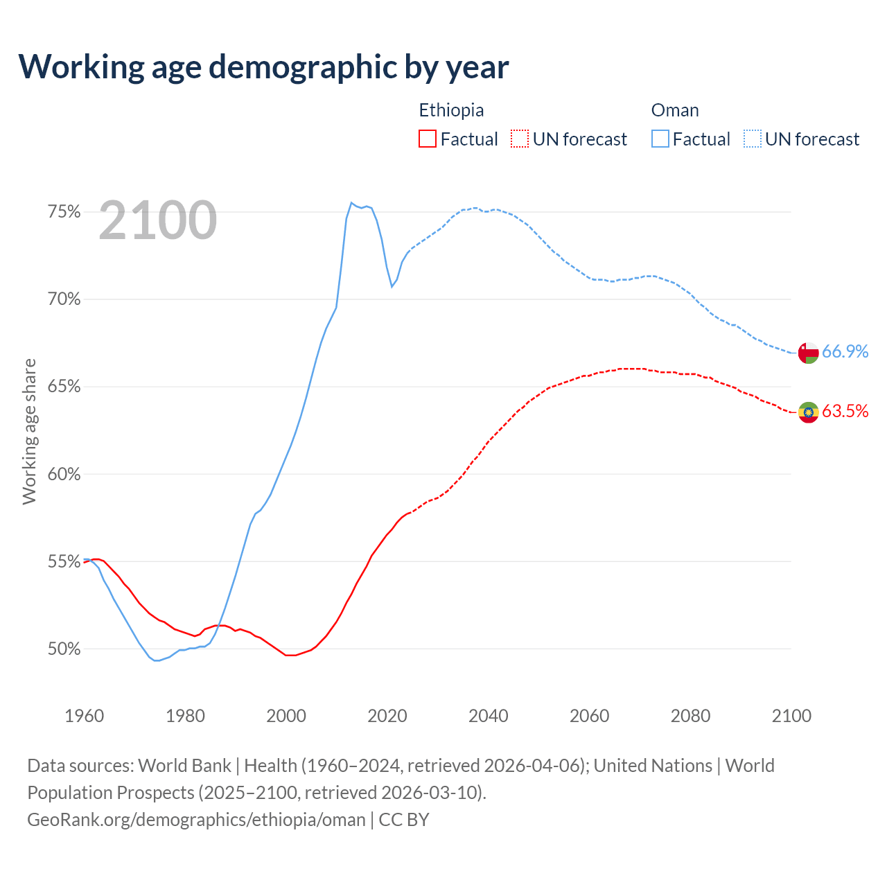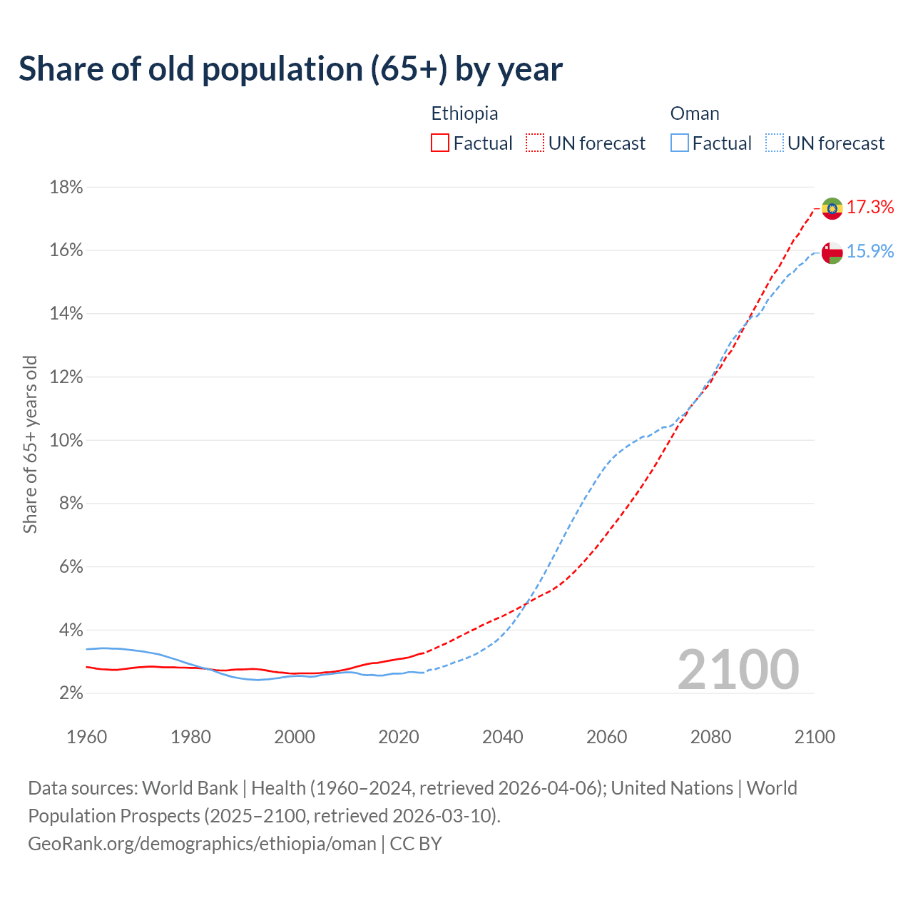 The share of older people aged 65 and over is 3.23% in Ethiopia and 2.64% in Oman. Life expectancy in Ethiopia compared to Oman .