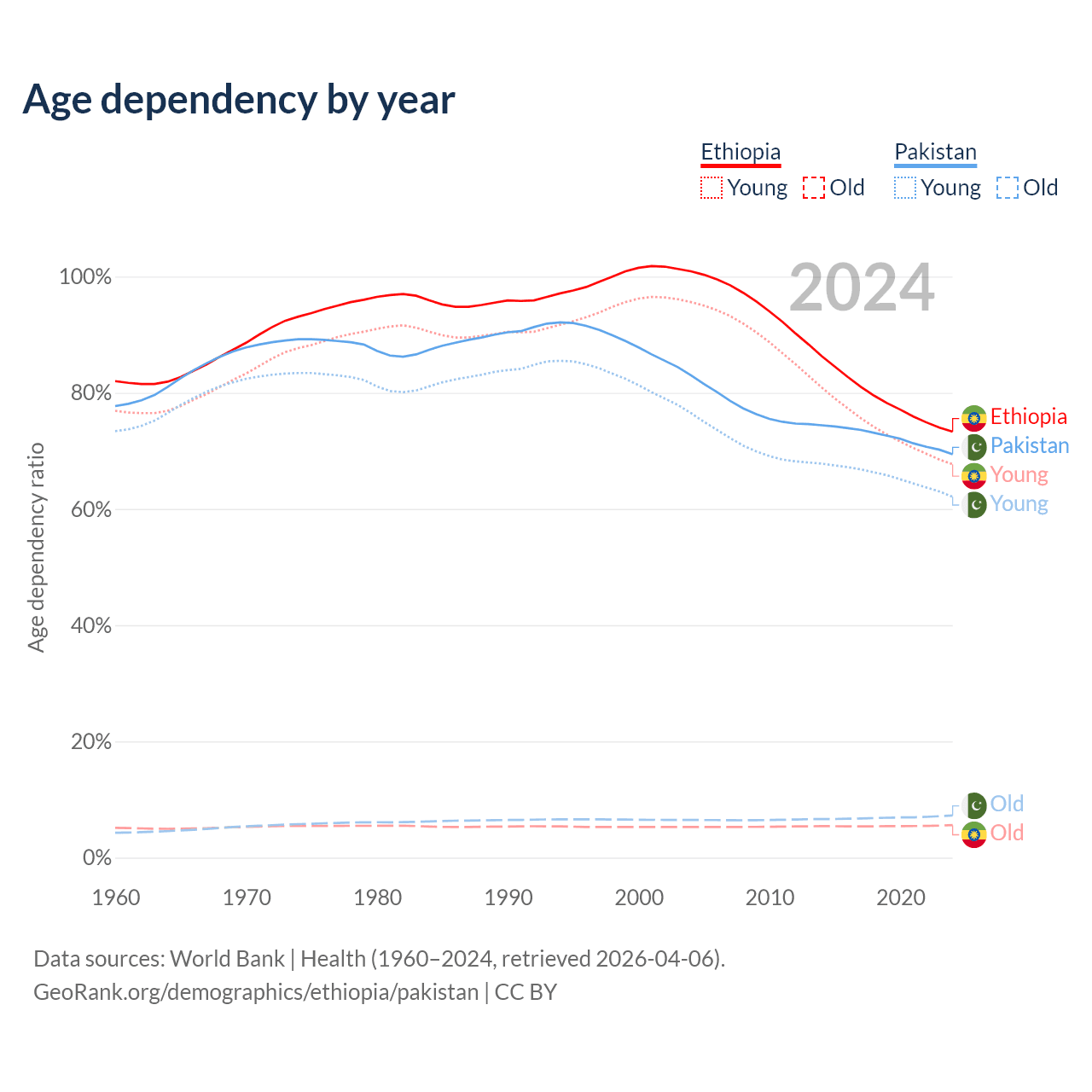 - Ethiopia is ranked 167/196 by median age (oldest to youngest) vs 154/196 for Pakistan.