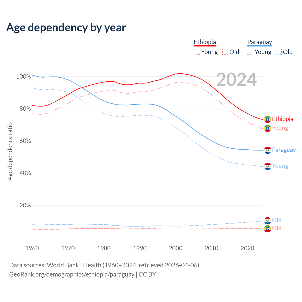 - Ethiopia is ranked 167/196 by median age (oldest to youngest) vs 118/196 for Paraguay.