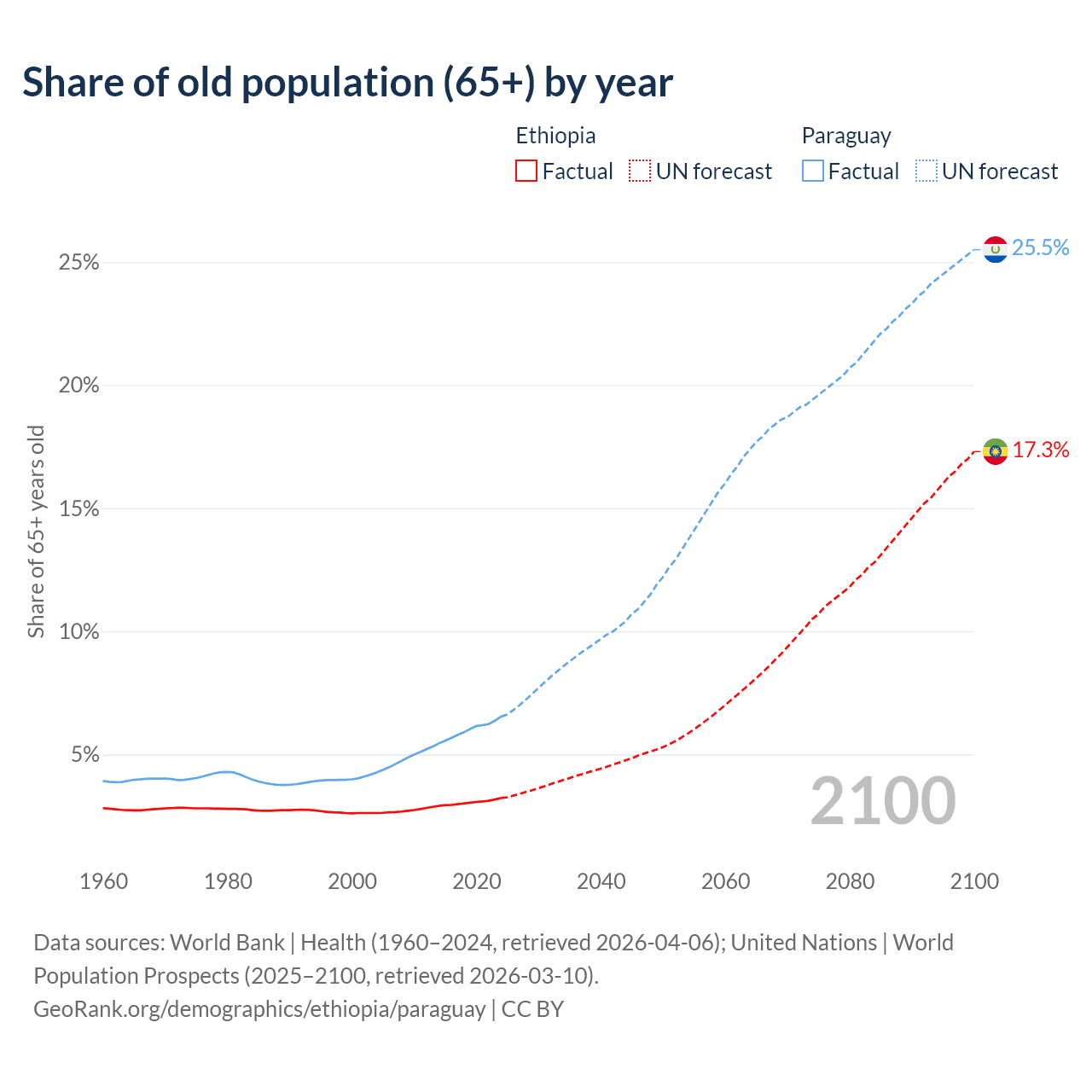 The share of older people aged 65 and over is 3.23% in Ethiopia and 6.54% in Paraguay. Life expectancy in Ethiopia compared to Paraguay .
