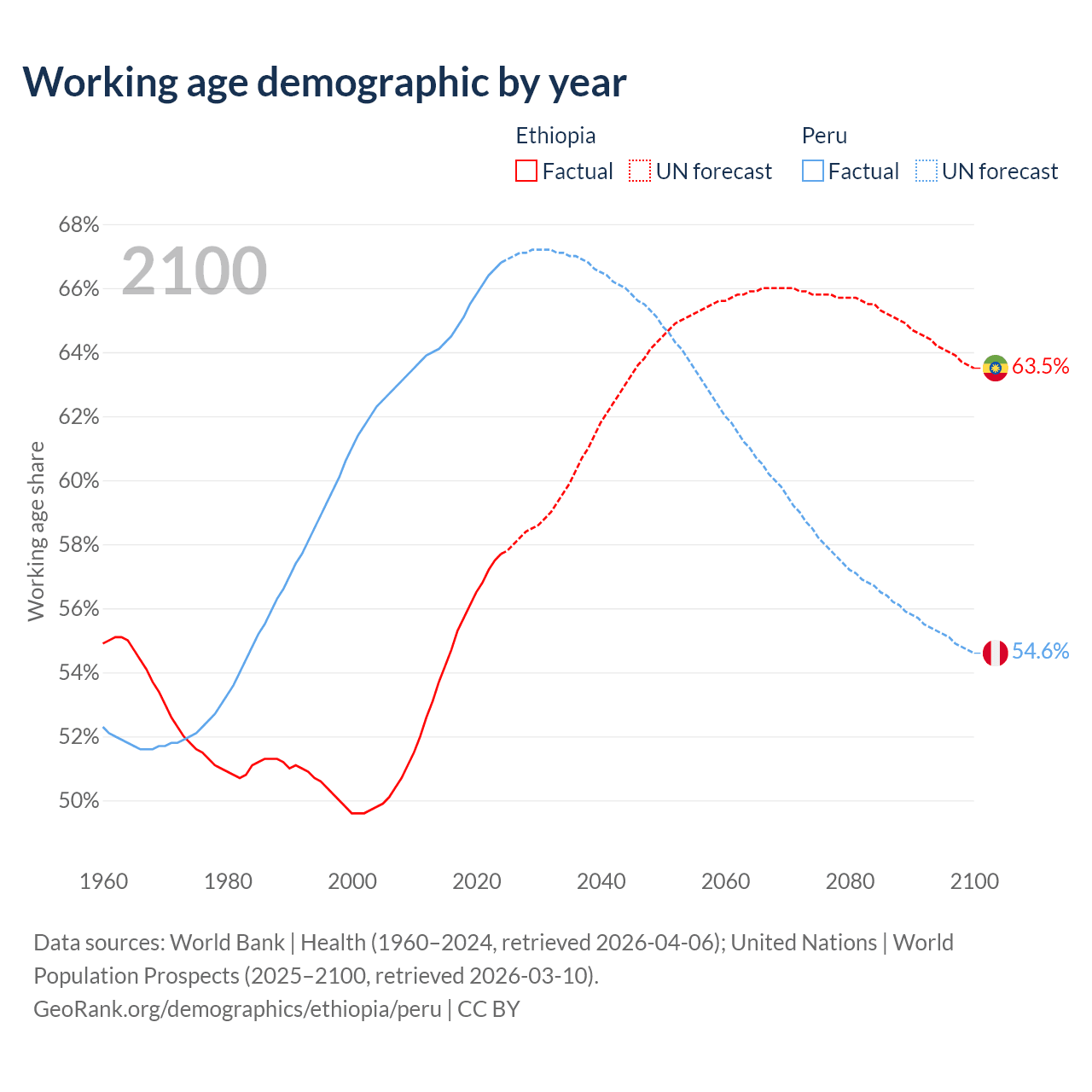- Ethiopia has 80.7M working age adults (aged 15-64) vs 23.4M in Peru.