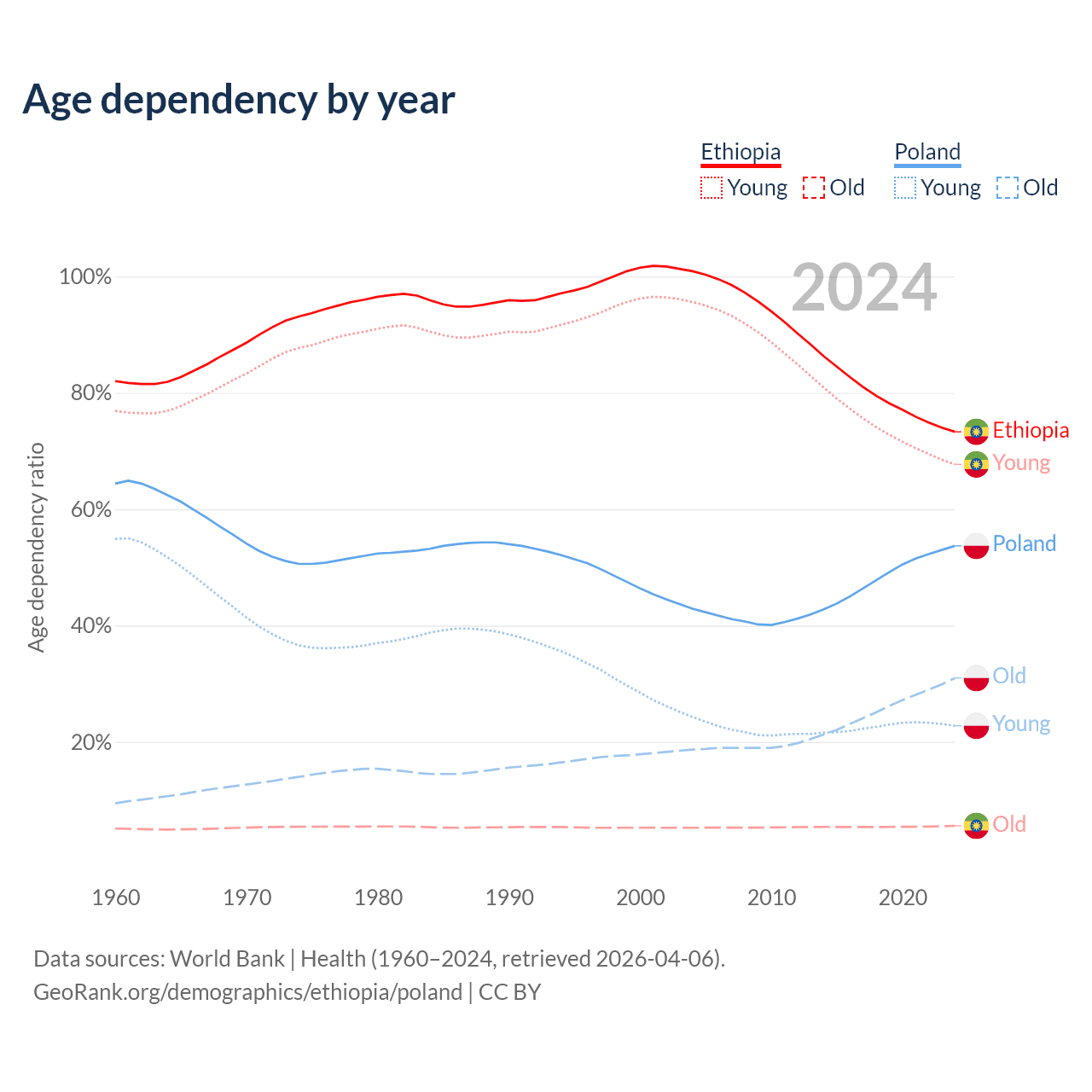 The share of older people aged 65 and over is 3.23% in Ethiopia and 20.1% in Poland. Life expectancy in Ethiopia compared to Poland .