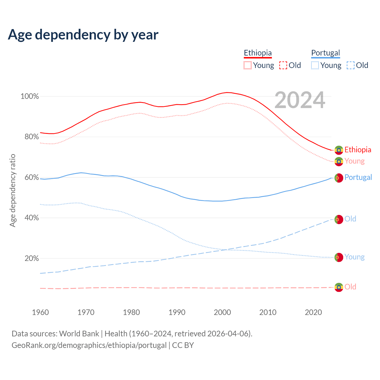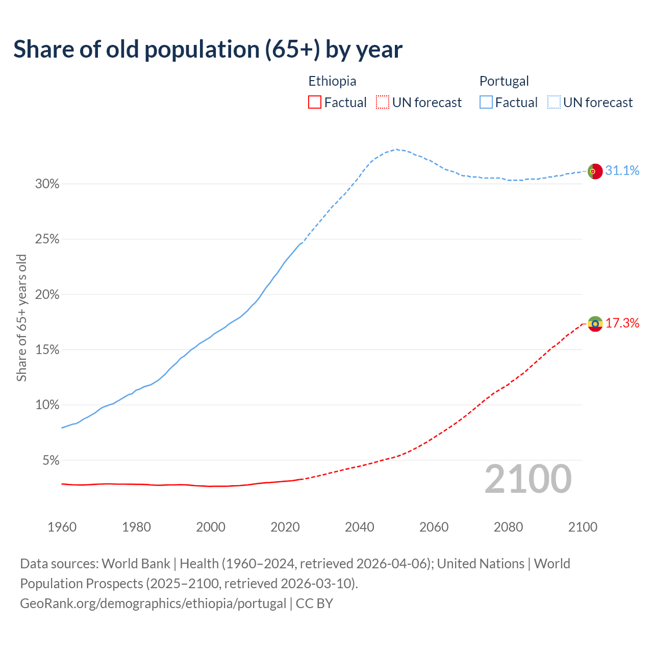 The share of older people aged 65 and over is 3.23% in Ethiopia and 24.5% in Portugal. Life expectancy in Ethiopia compared to Portugal .