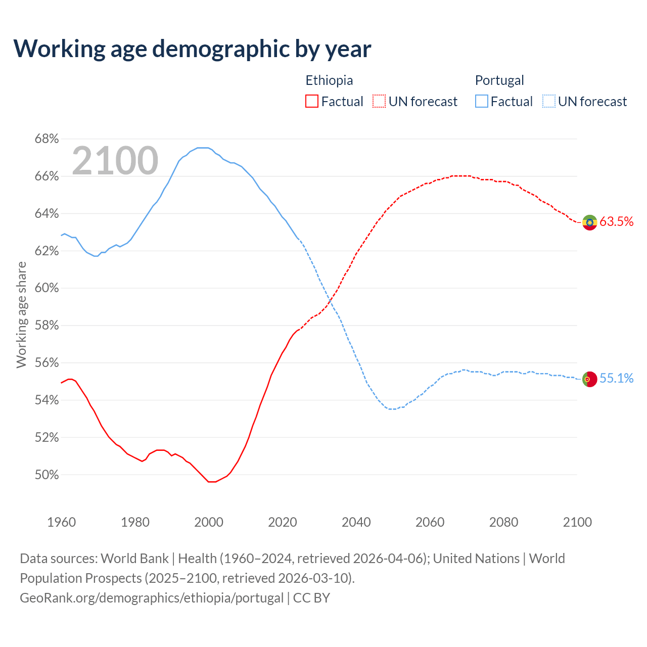 - Ethiopia has 80.7M working age adults (aged 15-64) vs 6.68M in Portugal.