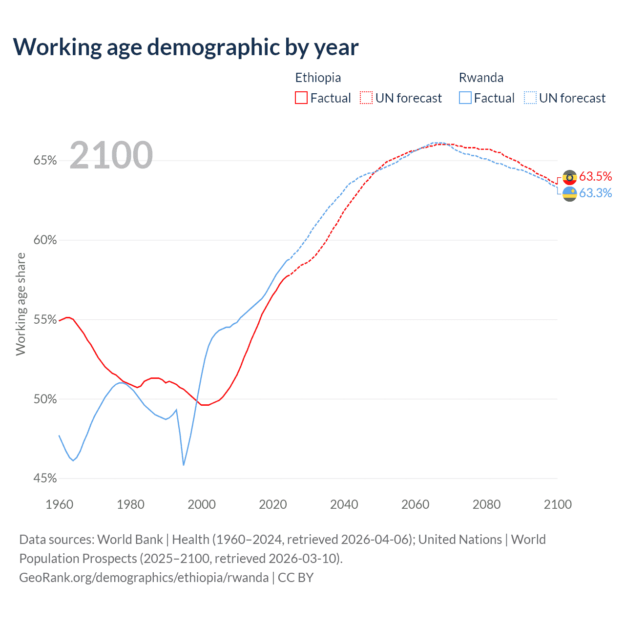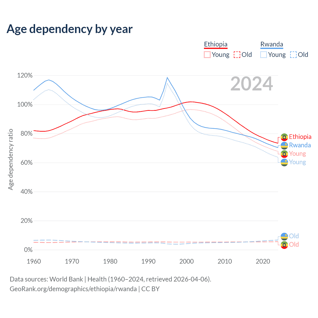 The share of older people aged 65 and over is 3.23% in Ethiopia and 3.93% in Rwanda. Life expectancy in Ethiopia compared to Rwanda .