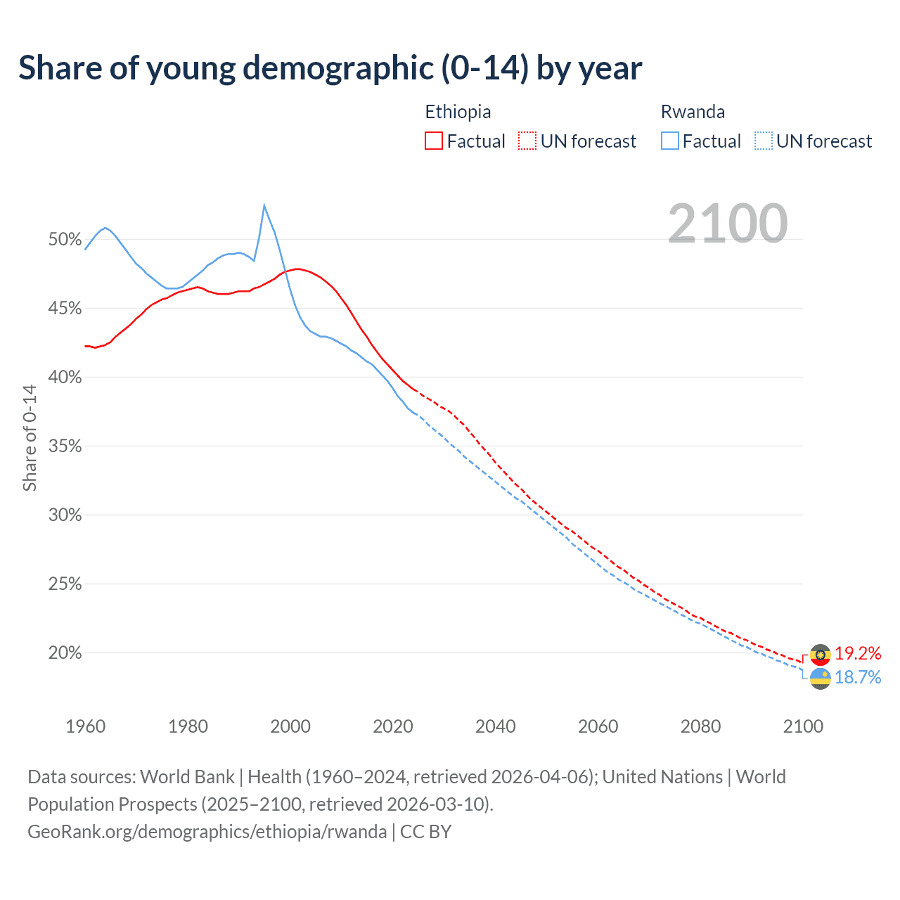 Median age Ethiopia vs Rwanda, 1960-2100