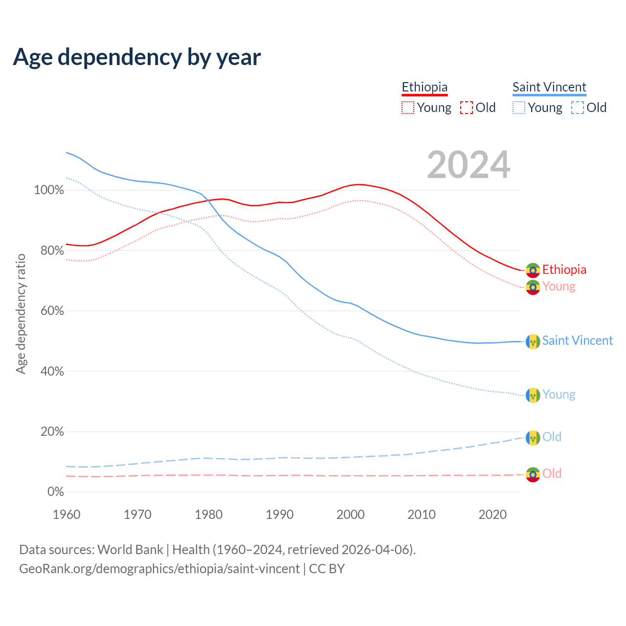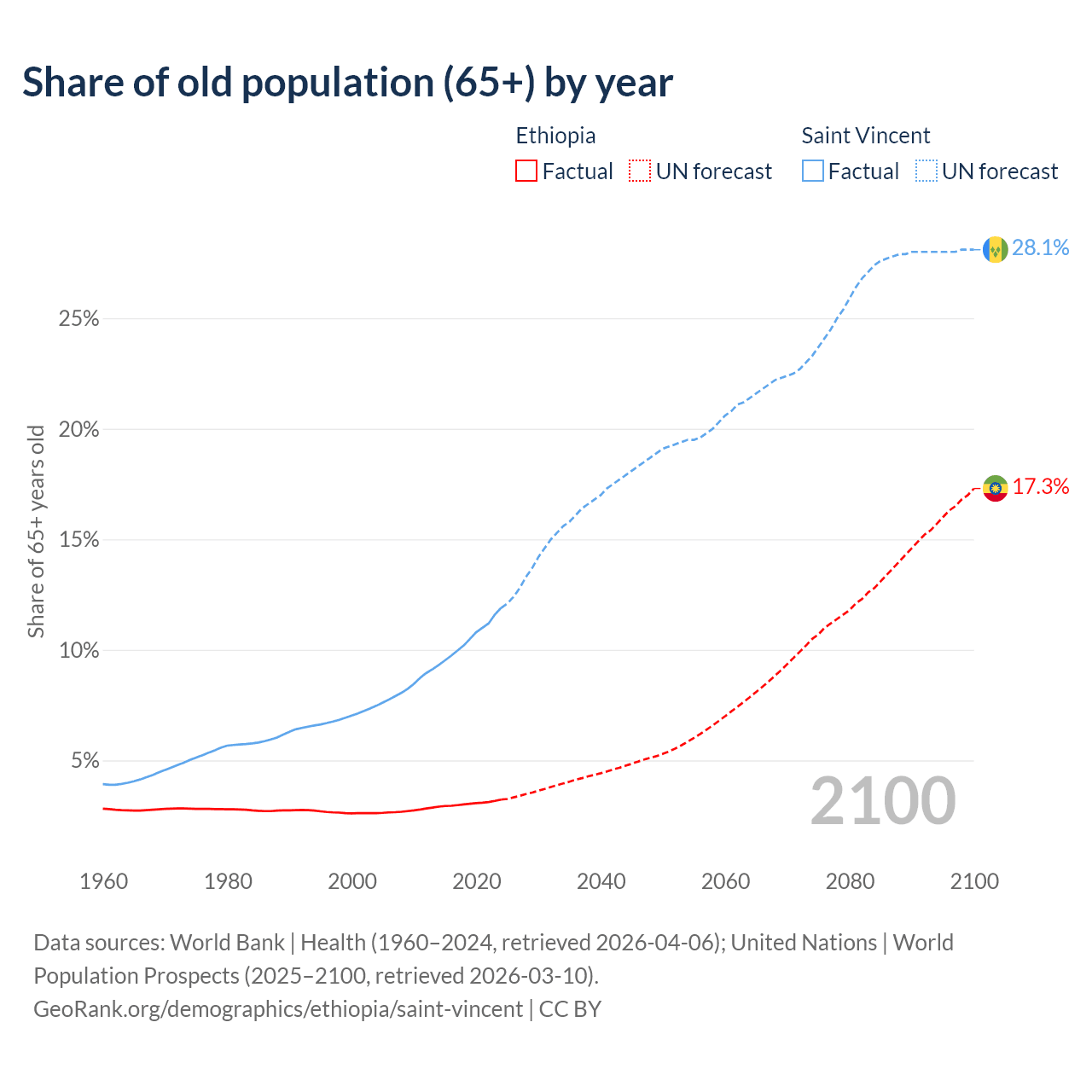 - The share of old-age demographic (65+) in Ethiopia is 3.23% vs 11.9% in Saint Vincent.