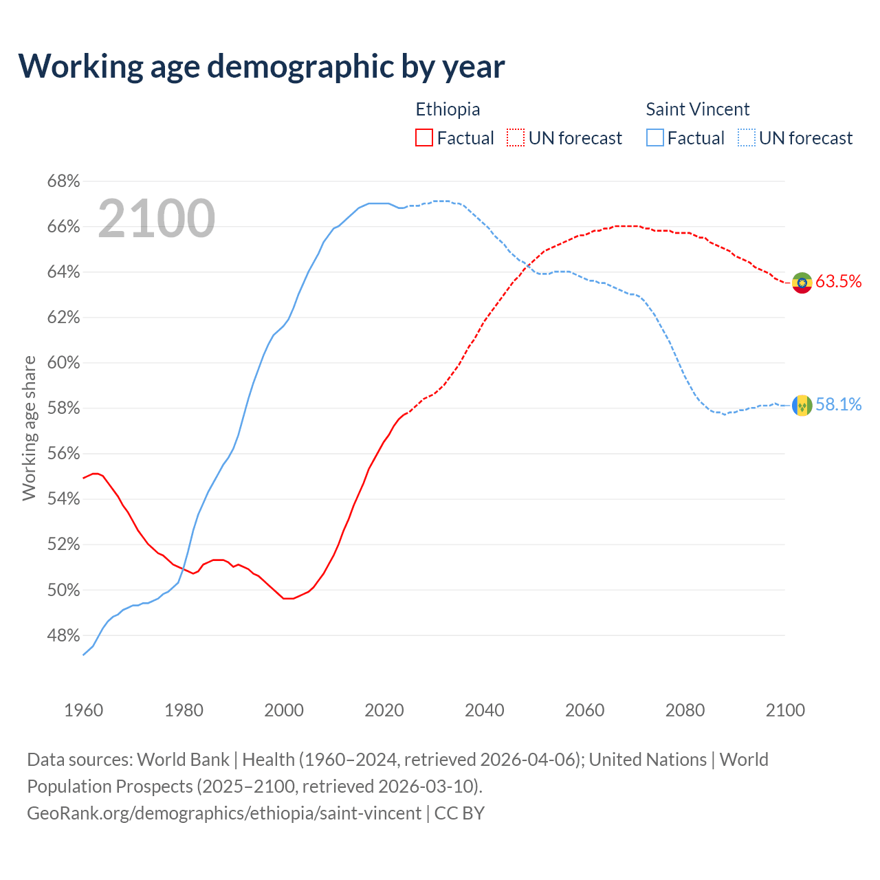 - Ethiopia has 80.7M working age adults (aged 15-64) vs 66.3K in Saint Vincent.