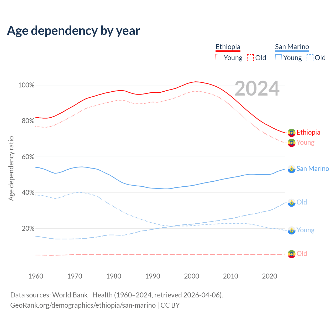- The share of old-age demographic (65+) in Ethiopia is 3.23% vs 22.4% in San Marino.