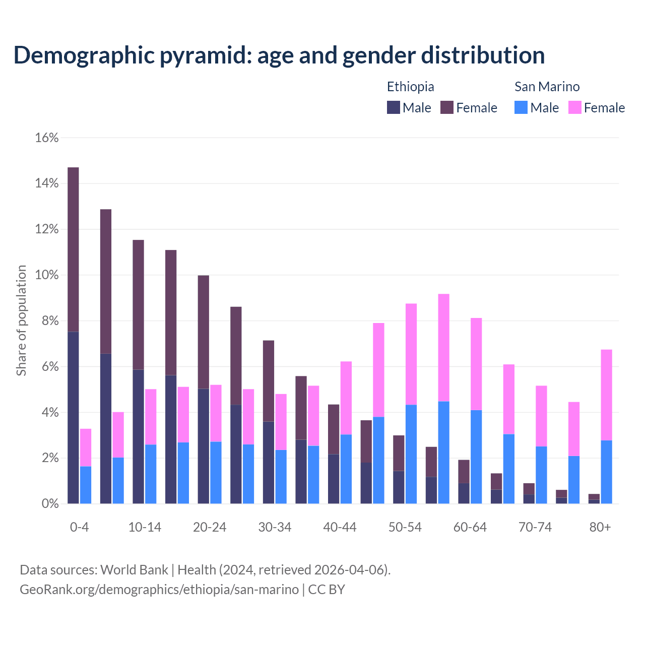 - Ethiopia is ranked 167/196 by median age (oldest to youngest) vs 3/196 for San Marino.