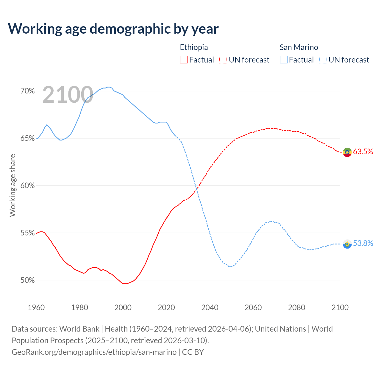 - Ethiopia has 80.7M working age adults (aged 15-64) vs 22.2K in San Marino.