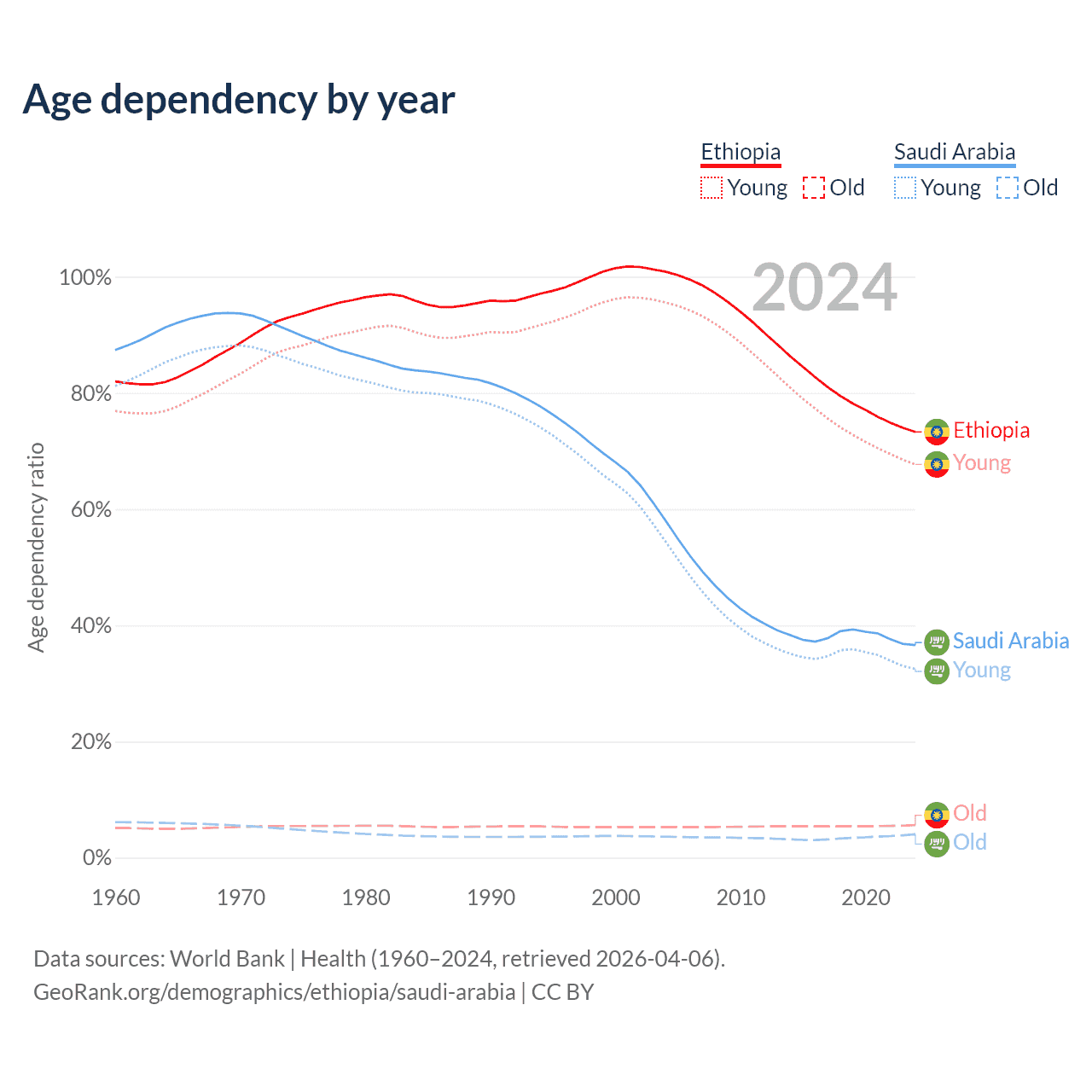 - Ethiopia is ranked 167/196 by median age (oldest to youngest) vs 98/196 for Saudi Arabia.