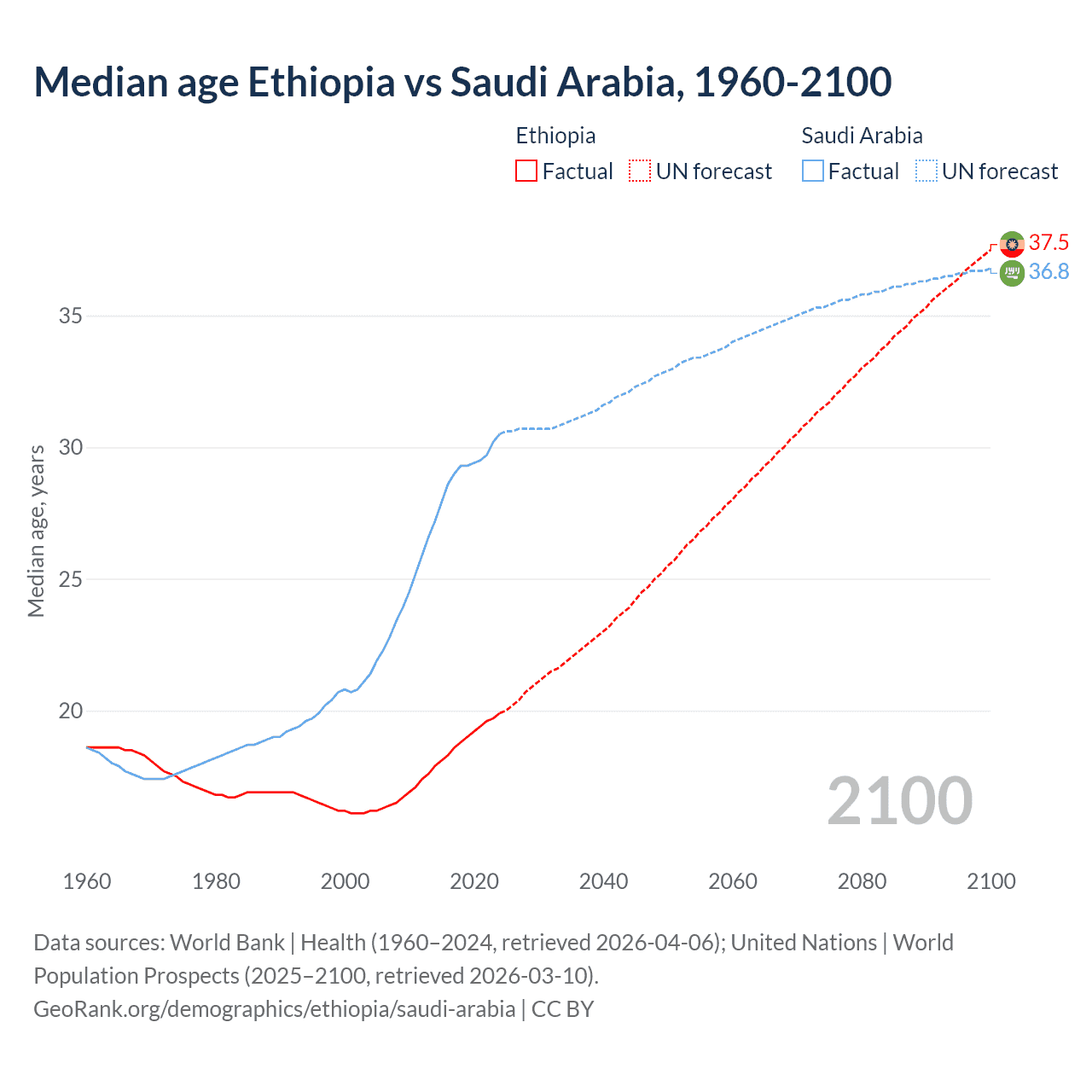Median age Ethiopia vs Saudi Arabia, 1960-2100