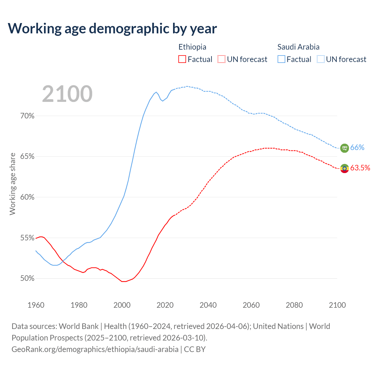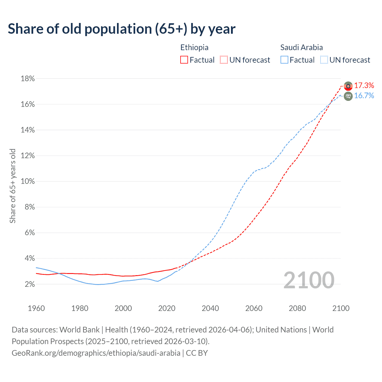 The share of older people aged 65 and over is 3.23% in Ethiopia and 2.95% in Saudi Arabia. Life expectancy in Ethiopia compared to Saudi Arabia .