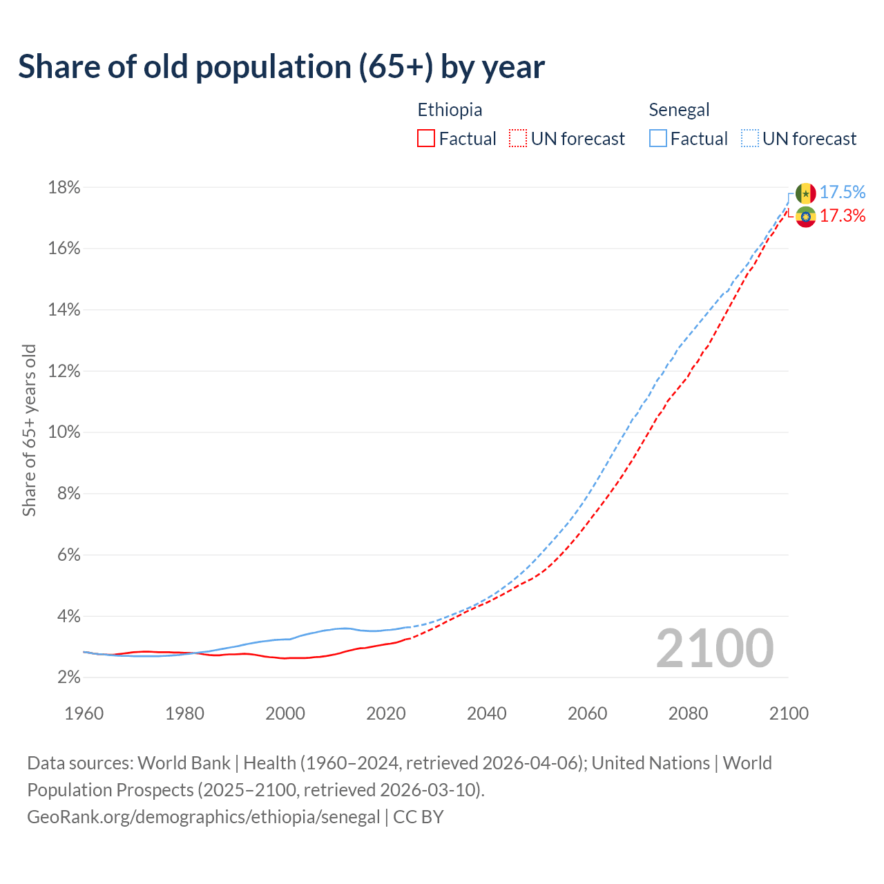 The share of older people aged 65 and over is 3.23% in Ethiopia and 3.62% in Senegal. Life expectancy in Ethiopia compared to Senegal .