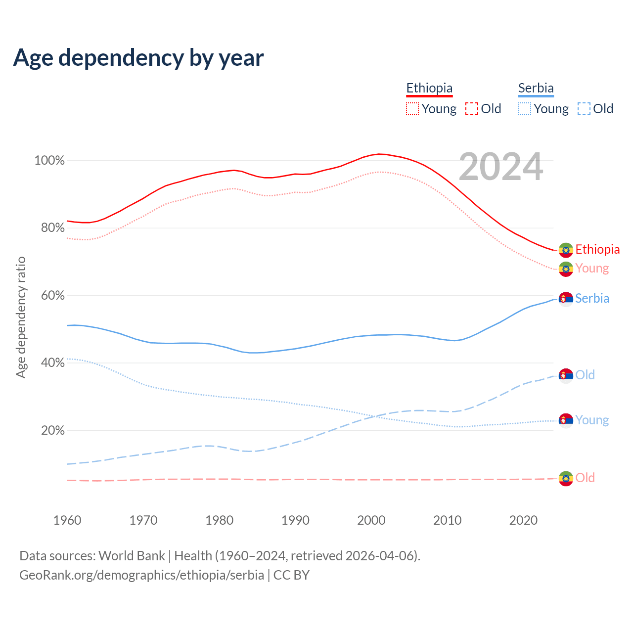 - Ethiopia is ranked 167/196 by median age (oldest to youngest) vs 15/196 for Serbia.