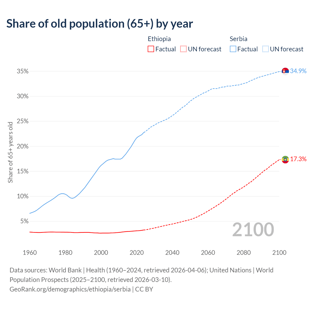 The share of older people aged 65 and over is 3.23% in Ethiopia and 22.7% in Serbia. Life expectancy in Ethiopia compared to Serbia .