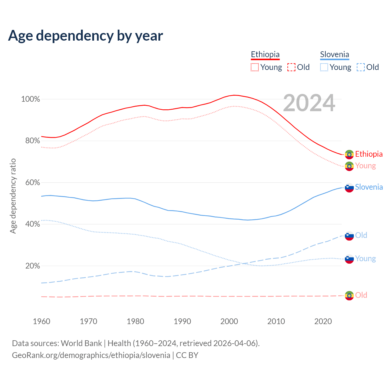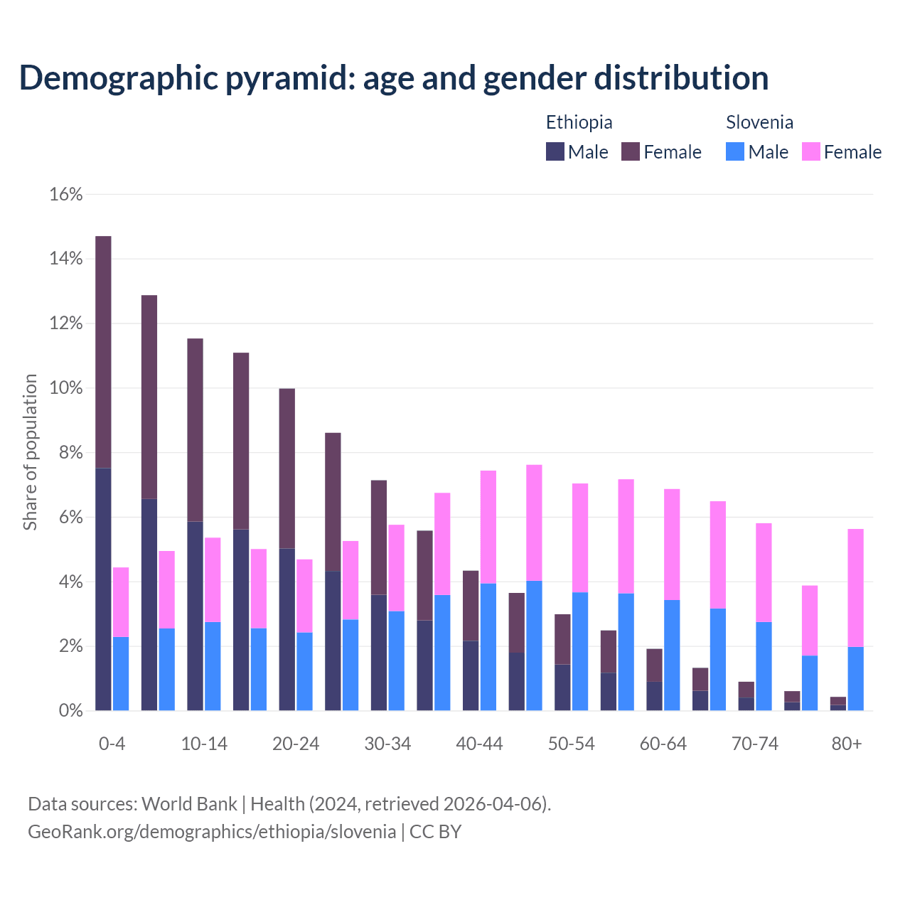 - The share of old-age demographic (65+) in Ethiopia is 3.23% vs 21.8% in Slovenia.