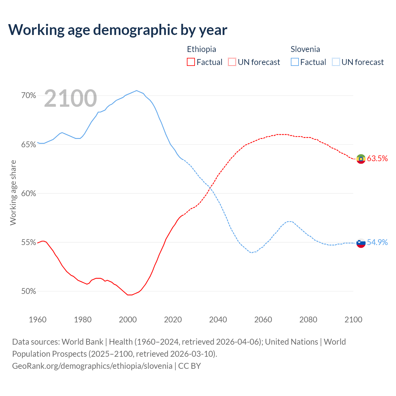 - Ethiopia has 80.7M working age adults (aged 15-64) vs 1.35M in Slovenia.