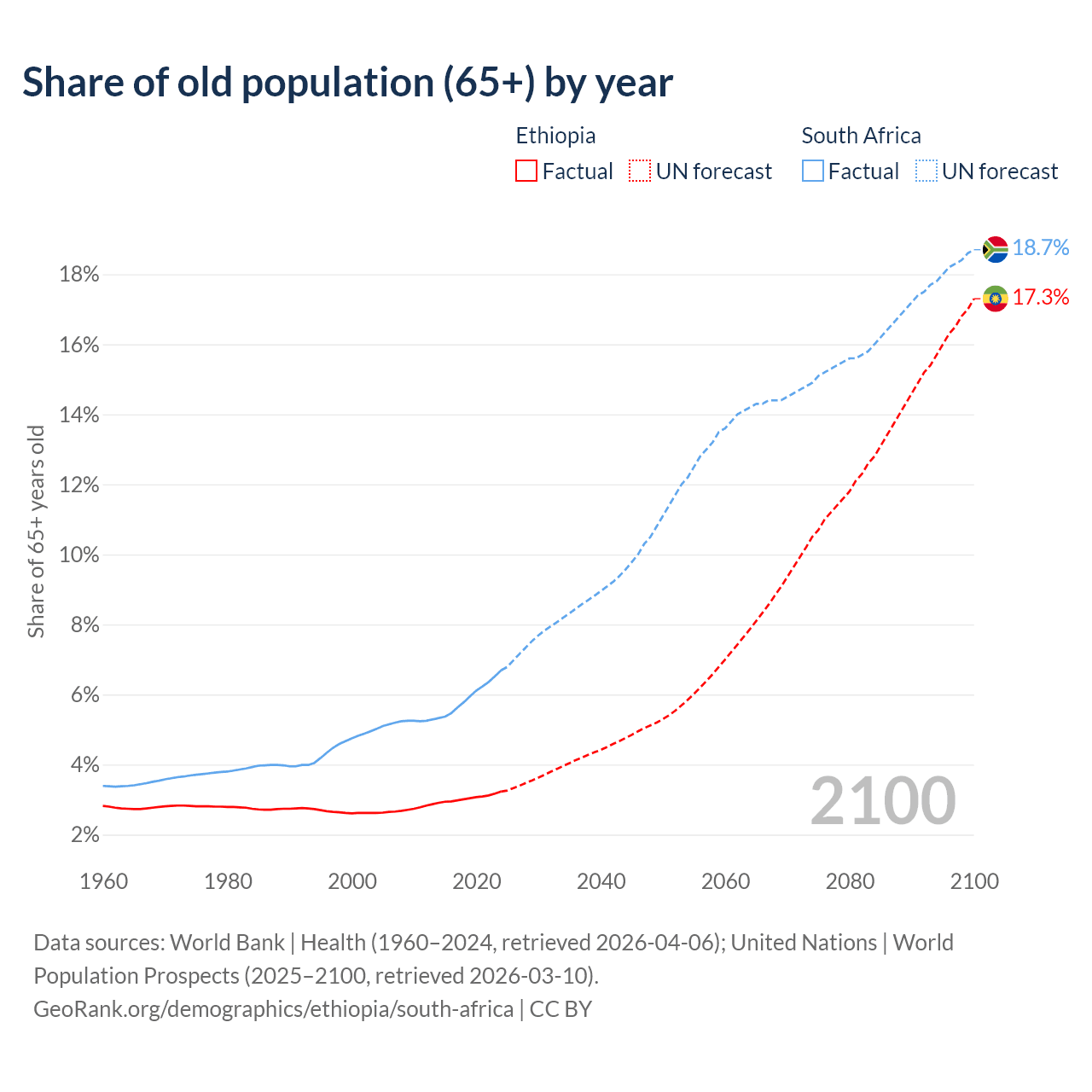 The share of older people aged 65 and over is 3.23% in Ethiopia and 6.69% in South Africa. Life expectancy in Ethiopia compared to South Africa .