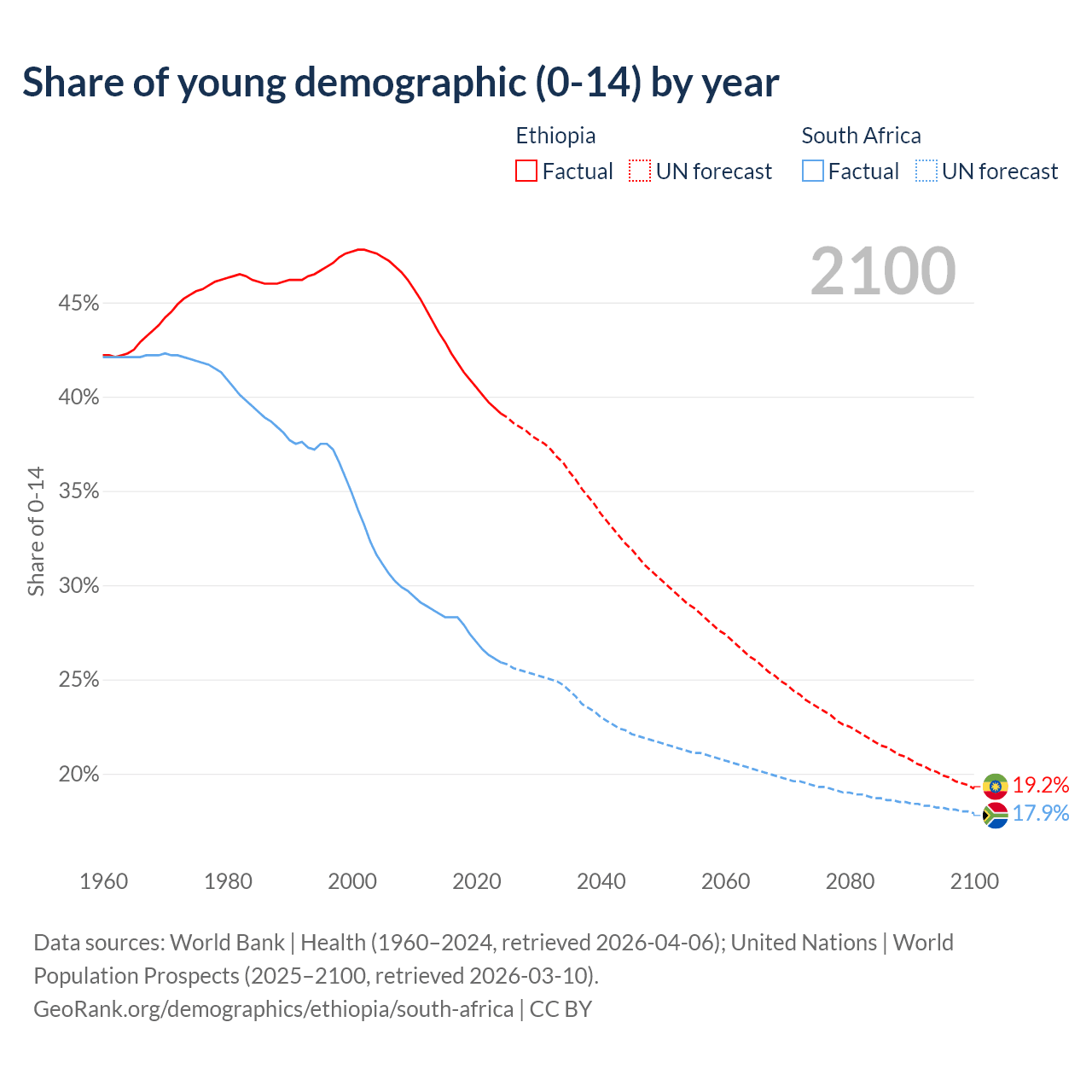 Median age Ethiopia vs South Africa, 1960-2100