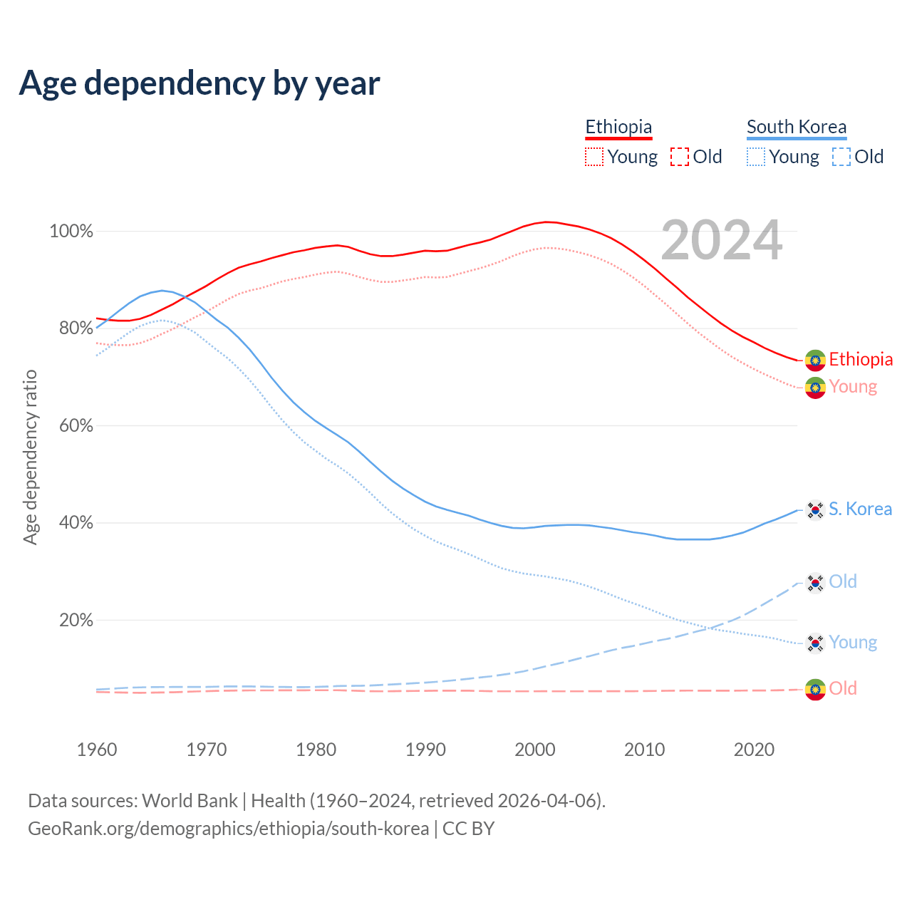 The share of older people aged 65 and over is 3.23% in Ethiopia and 19.3% in South Korea. Life expectancy in Ethiopia compared to South Korea .