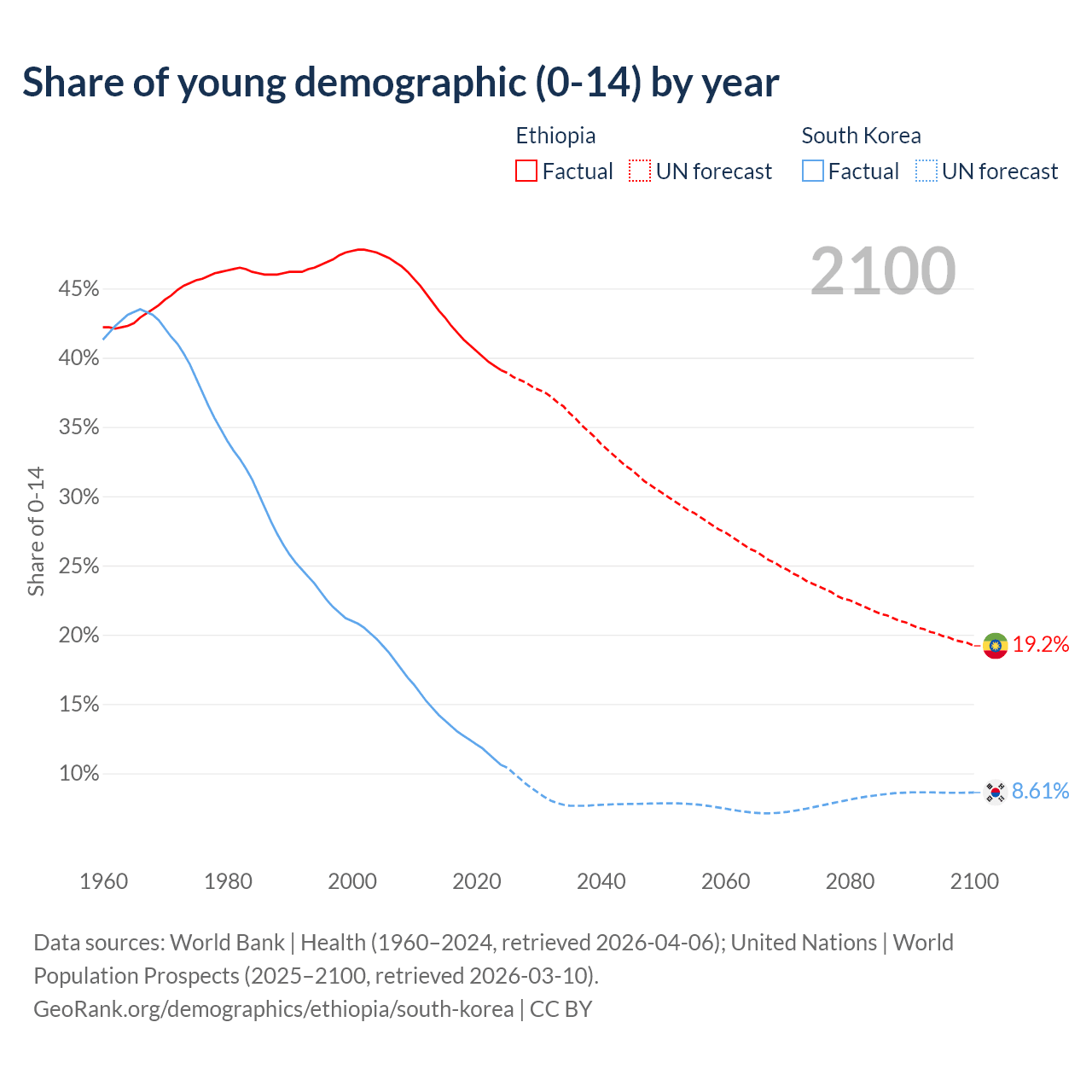 - The share of young demographic (0-15 years old) in Ethiopia is 39.1% vs 10.6% in South Korea.