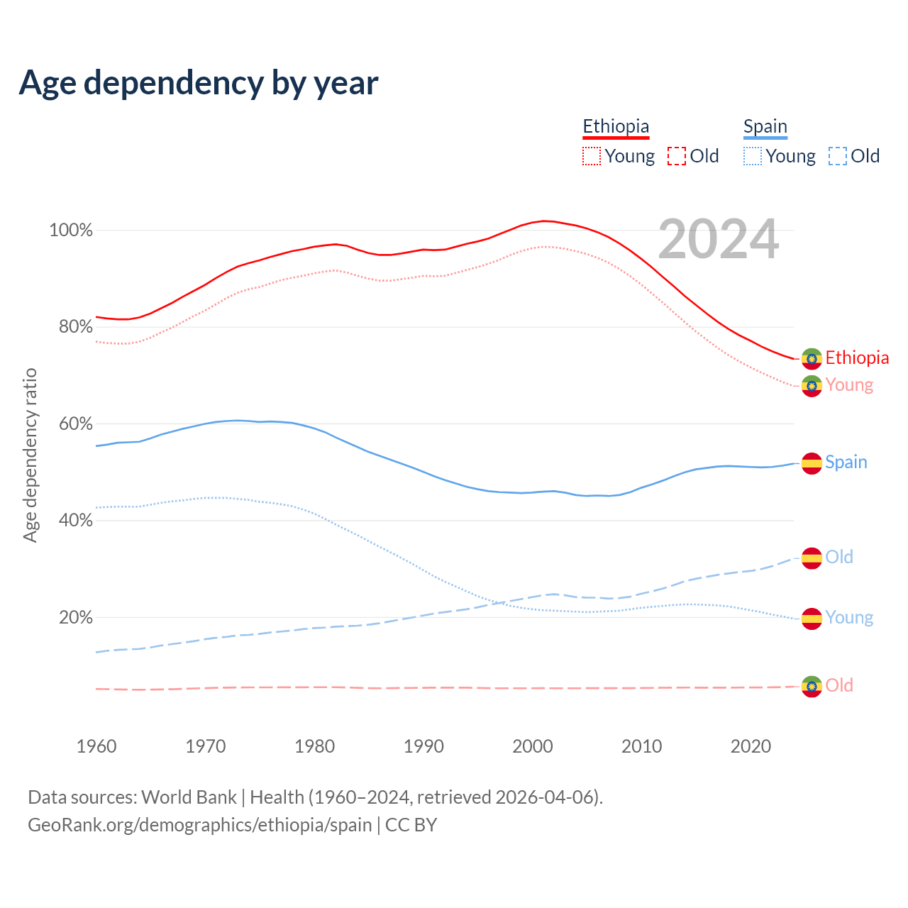 - The share of old-age demographic (65+) in Ethiopia is 3.23% vs 21.1% in Spain.