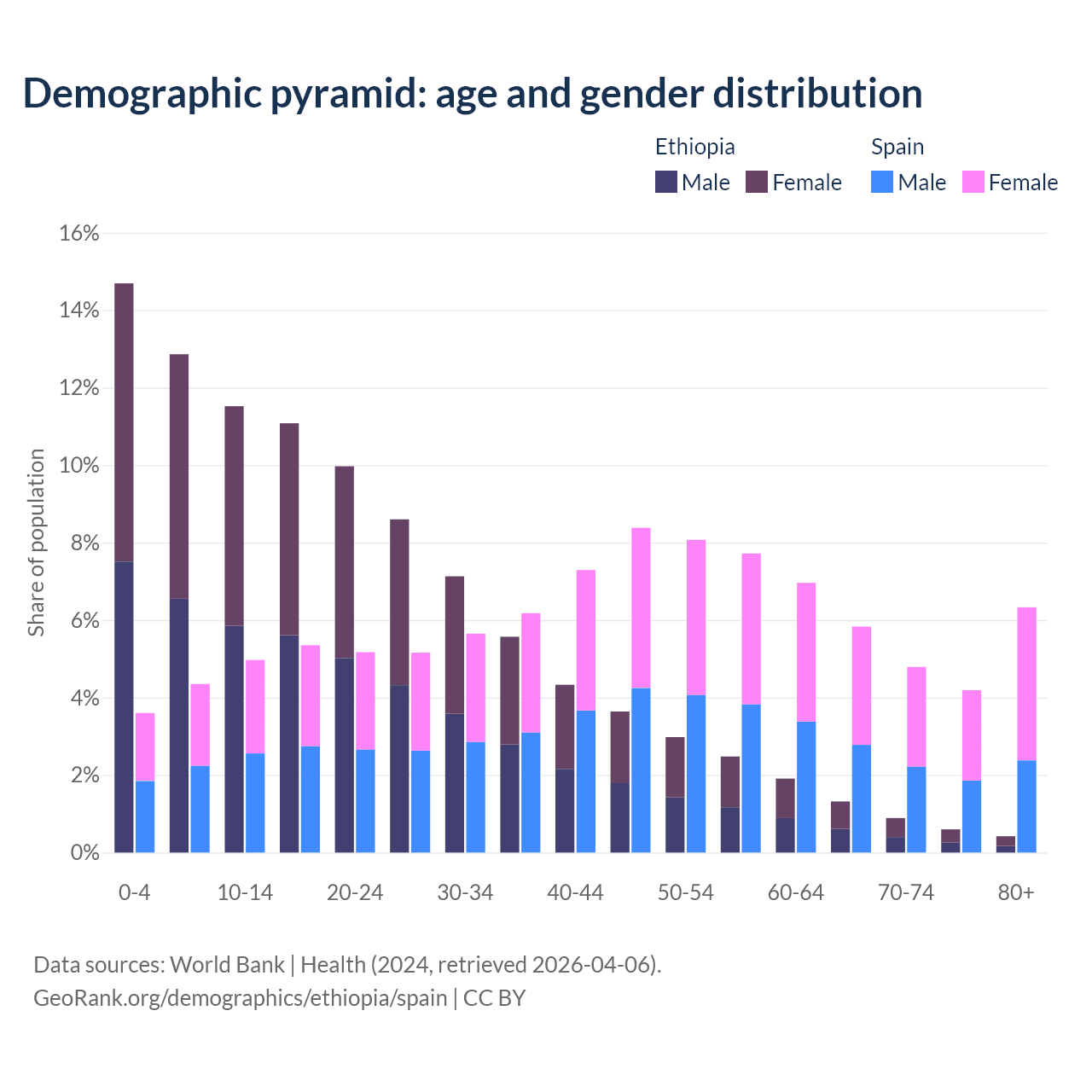 The share of older people aged 65 and over is 3.23% in Ethiopia and 21.1% in Spain. Life expectancy in Ethiopia compared to Spain .