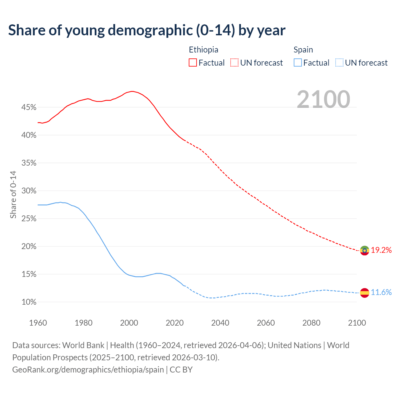 - The share of young demographic (0-15 years old) in Ethiopia is 39.1% vs 12.9% in Spain.