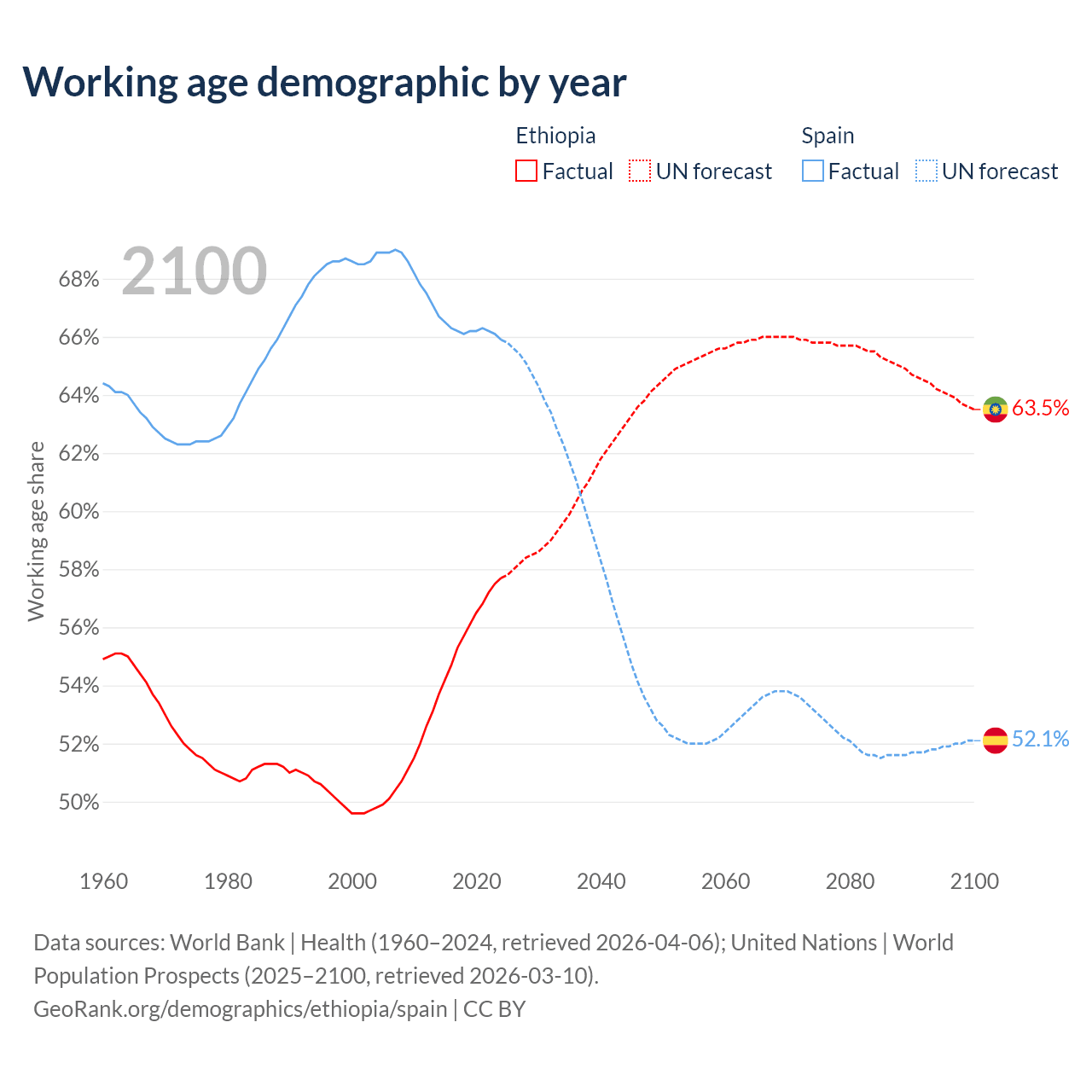 - Ethiopia has 80.7M working age adults (aged 15-64) vs 32.2M in Spain.
