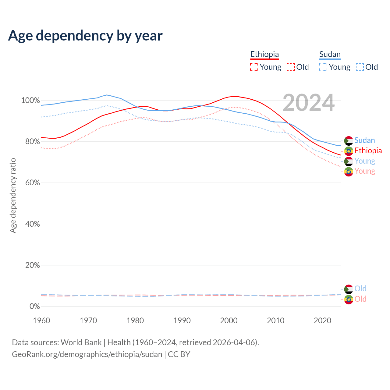 - Ethiopia is ranked 167/196 by median age (oldest to youngest) vs 172/196 for Sudan.
