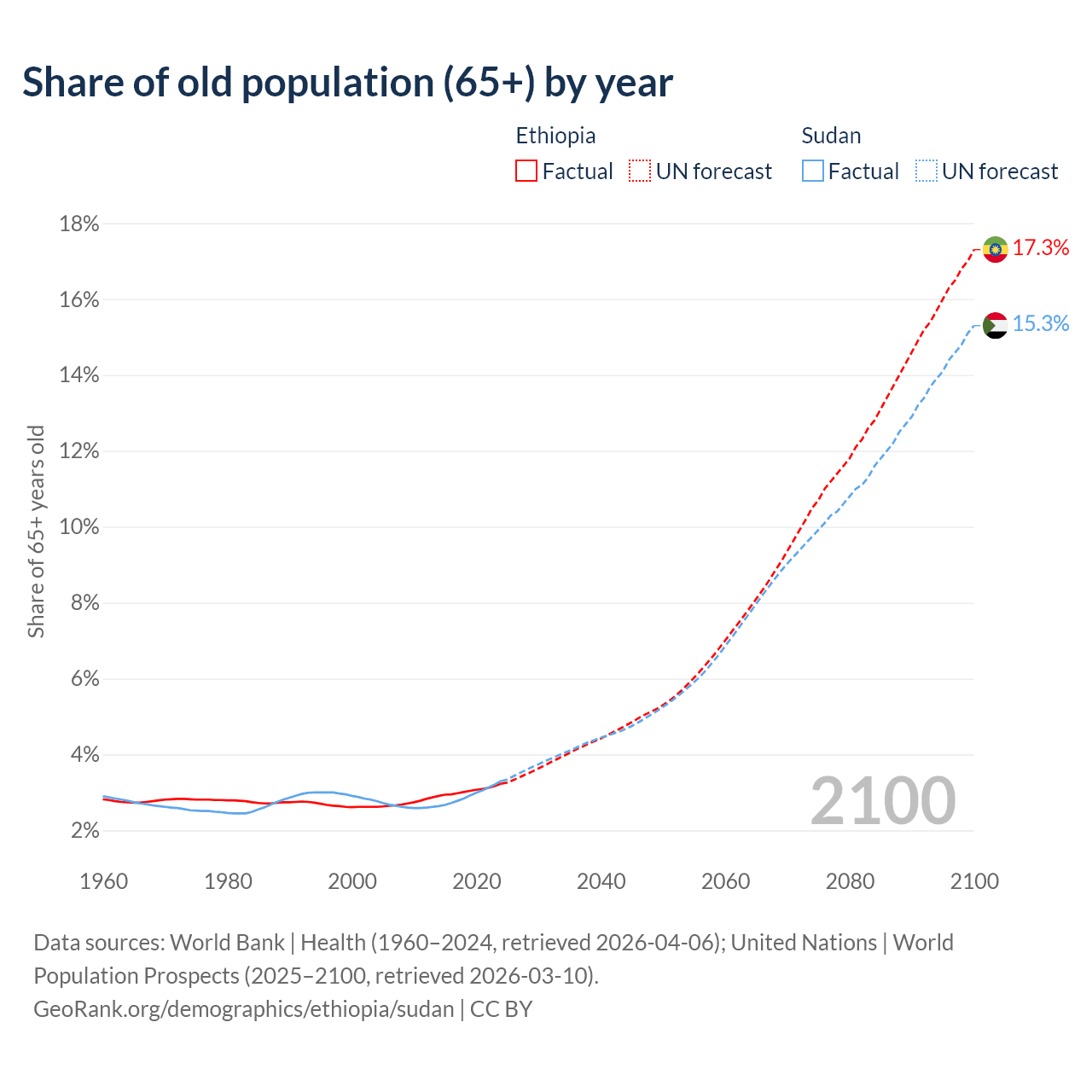 - The share of old-age demographic (65+) in Ethiopia is 3.23% vs 3.3% in Sudan.