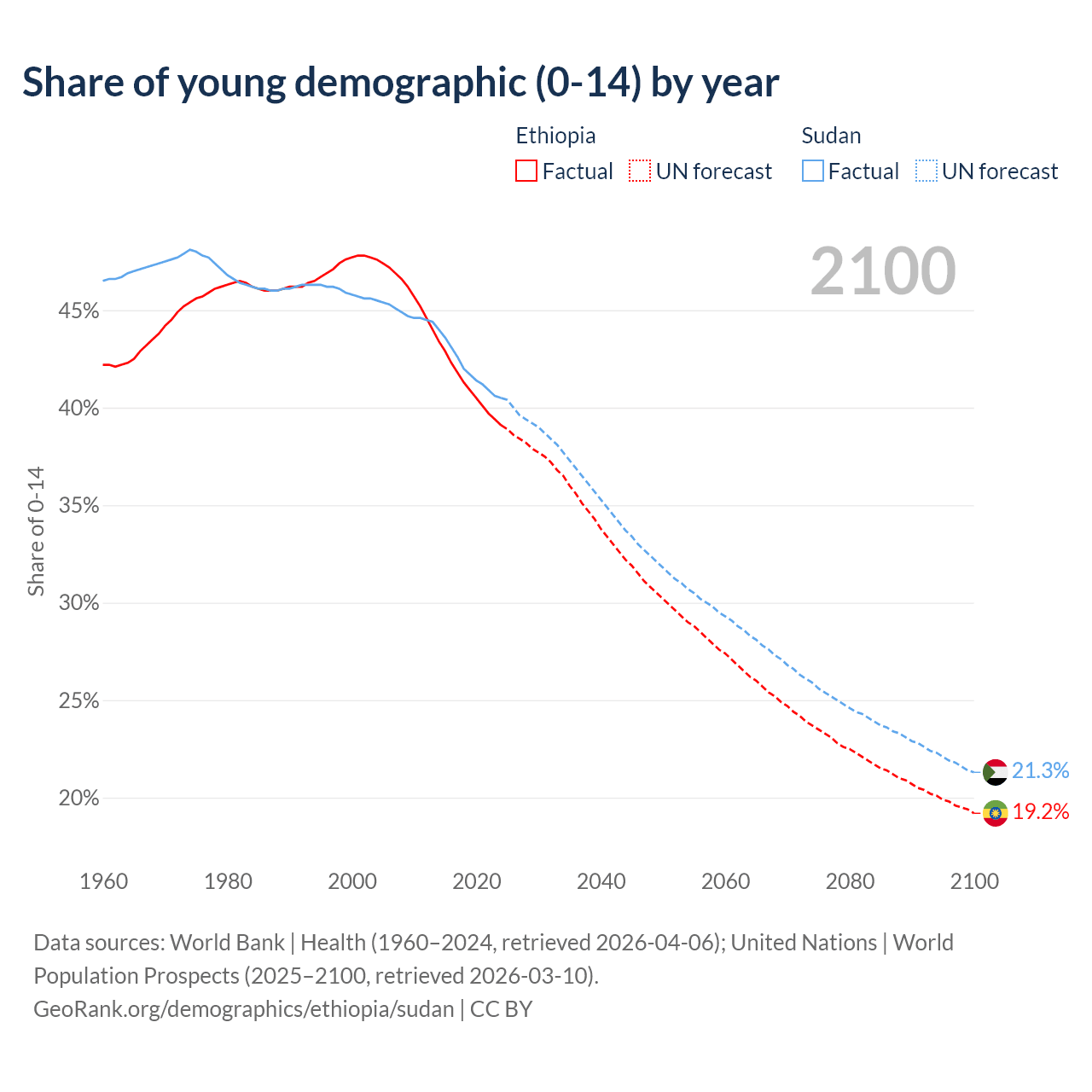 - The share of young demographic (0-15 years old) in Ethiopia is 39.1% vs 40.5% in Sudan.