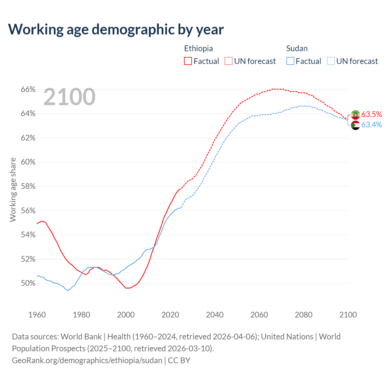 - Ethiopia has 80.7M working age adults (aged 15-64) vs 30M in Sudan.