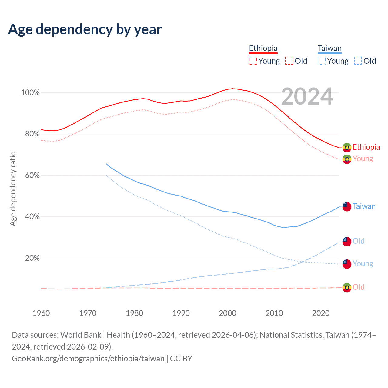 Data sources: World Bank | Health (1960–2024, retrieved 2026-04-06); U.S. Census Bureau (1960–2024, retrieved 2026-02-08); National Statistics, Taiwan (1974–2024, retrieved 2026-02-09).