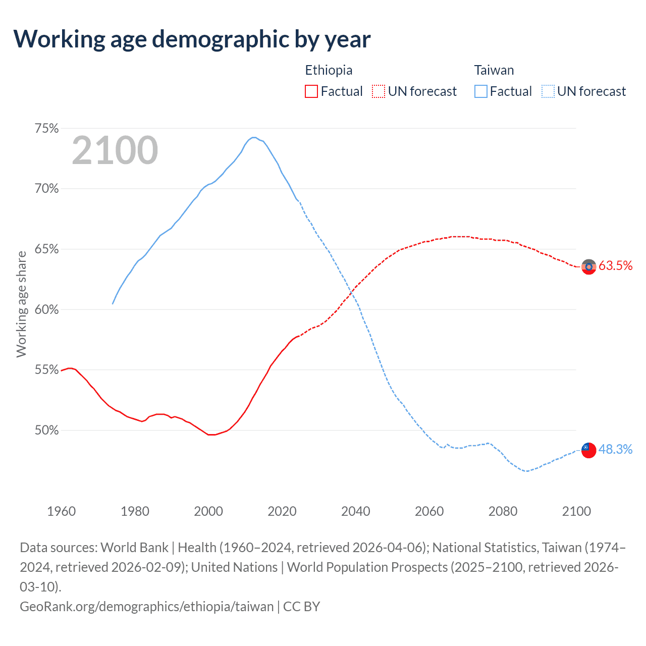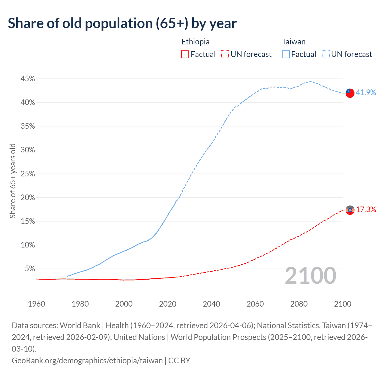 The share of older people aged 65 and over is 3.23% in Ethiopia and 19.2% in Taiwan. Life expectancy in Ethiopia compared to Taiwan .
