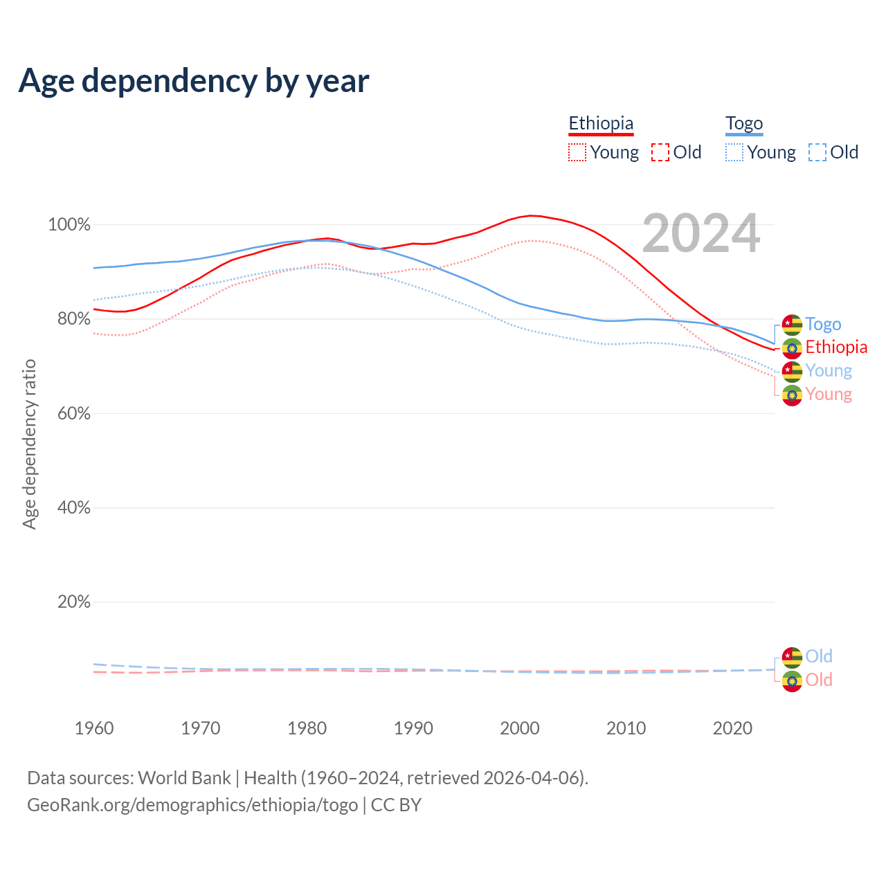 - Ethiopia is ranked 167/196 by median age (oldest to youngest) vs 166/196 for Togo.