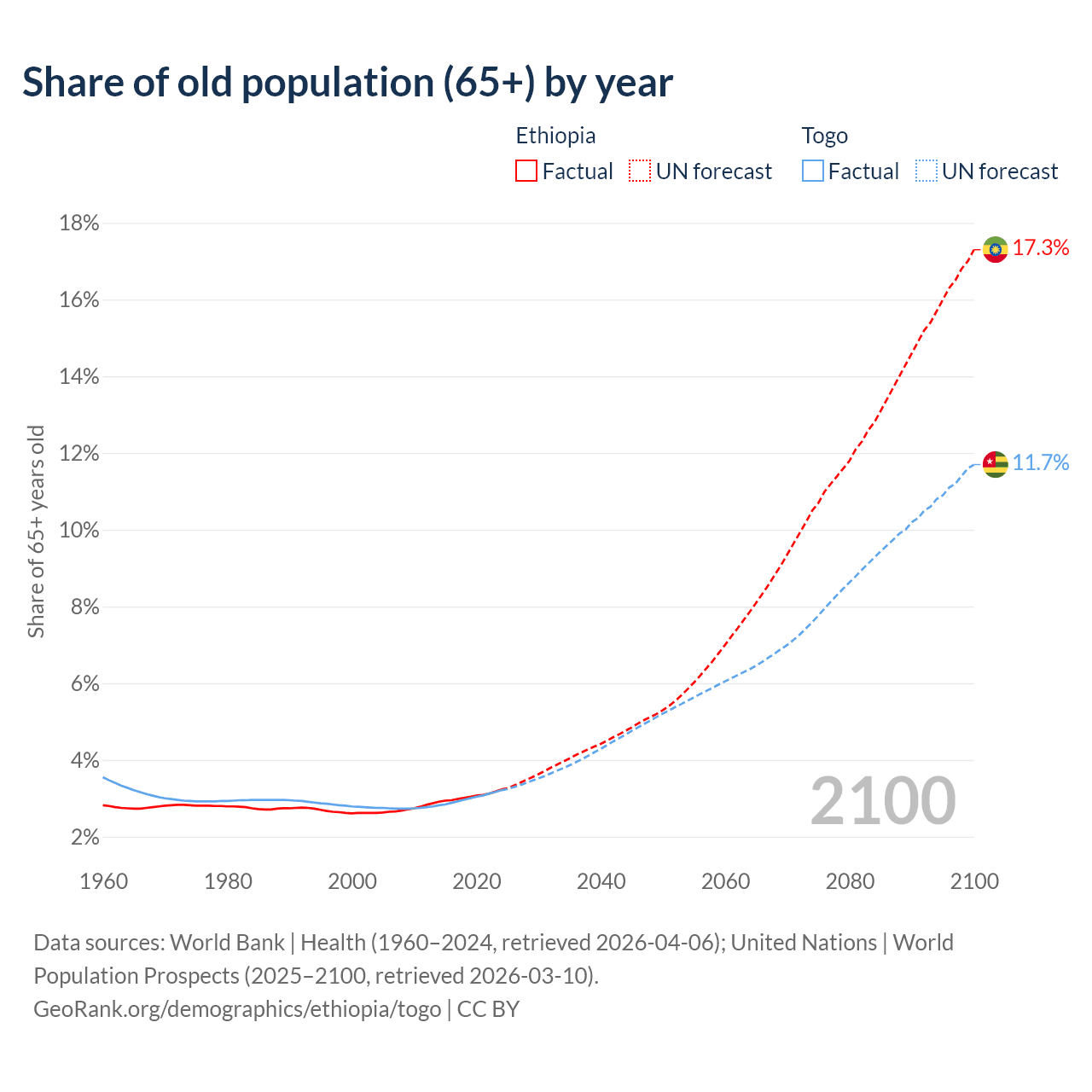 - The share of old-age demographic (65+) in Ethiopia is 3.23% vs 3.21% in Togo.